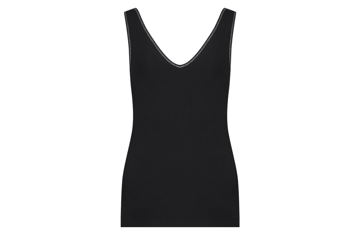 YOUR BEST LUXURY STYLE/8713782891033. Dit aangesloten model heeft een v-hals en is mouwloos. Deze zwarte tanktop van YOUR BEST LUXURY STYLE is afgewerkt met een lurex detail en is de perfecte basis tanktop.
