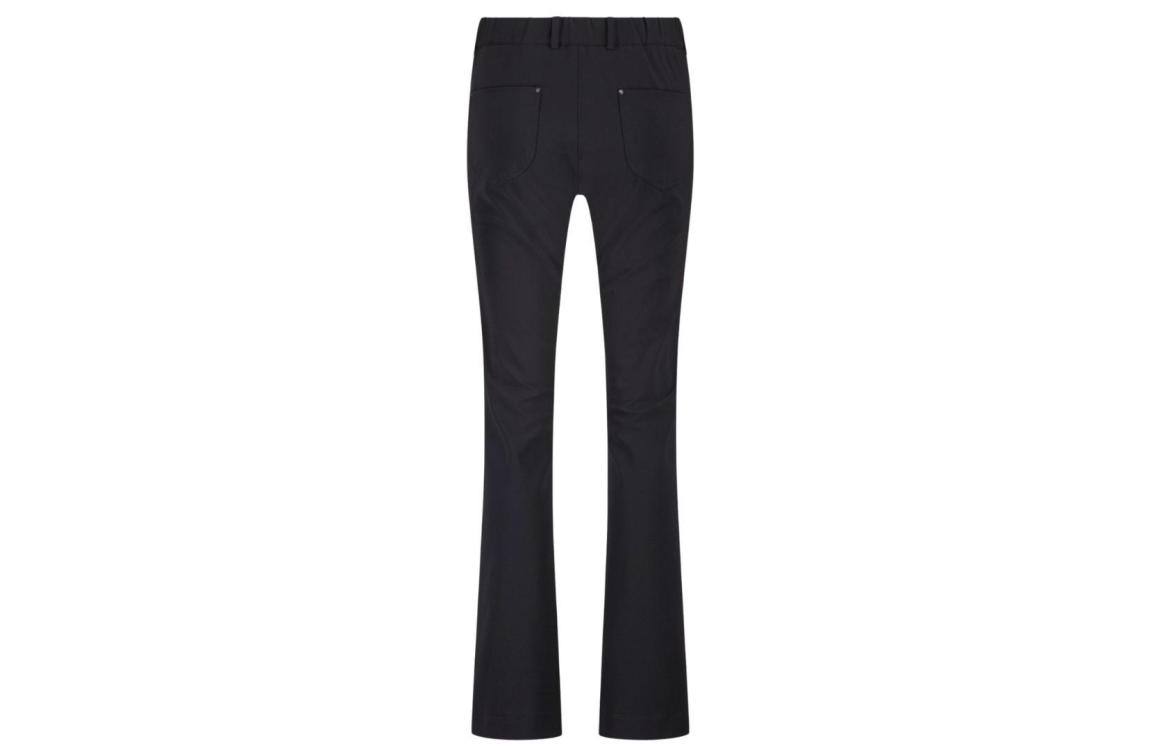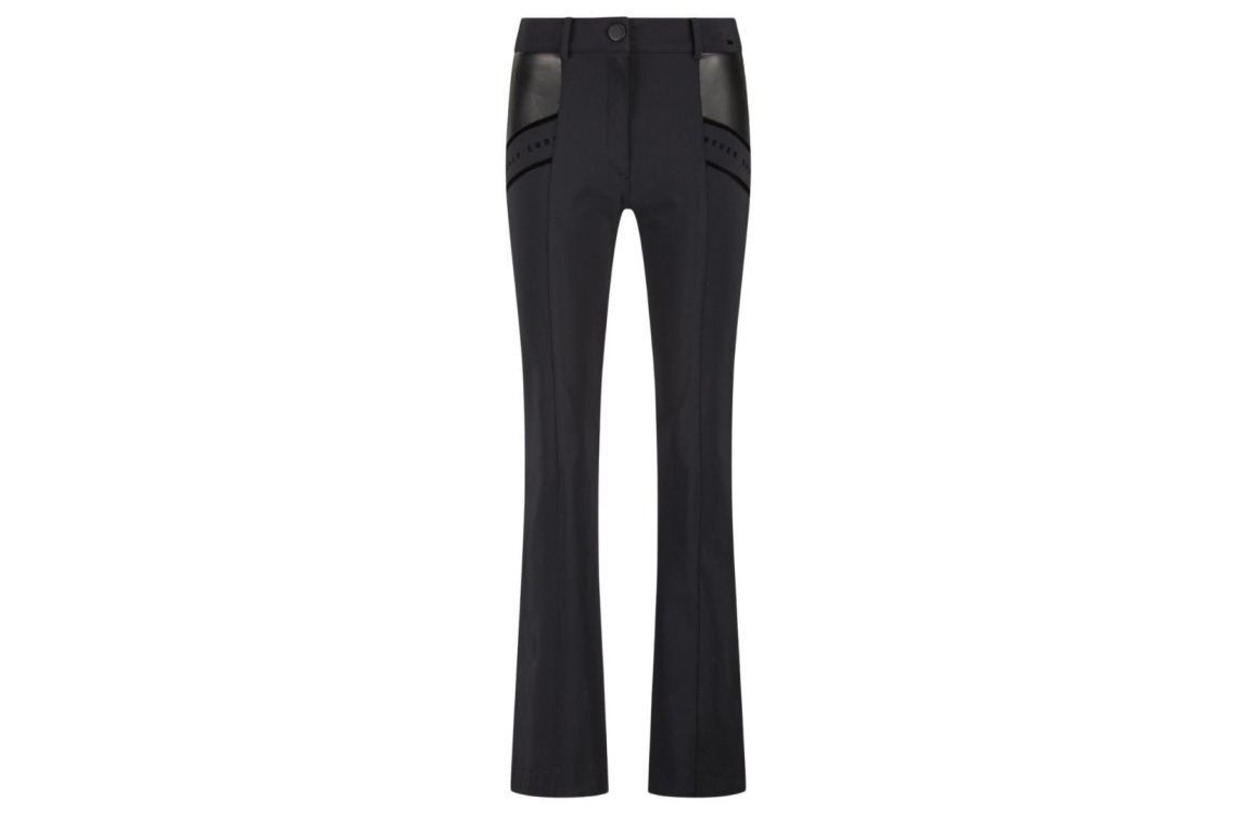 ZIP73 broek W25/110/02/005. Dit flared fit-model sluit met een knoop- en ritssluiting en is voorzien van ceintuurlussen. Deze zwarte broek van ZIP73 is aan de voorzijde bewerkt met leren en fluwelen details, letteropdruk en is uitgevoerd in travel-stretchkwaliteit.