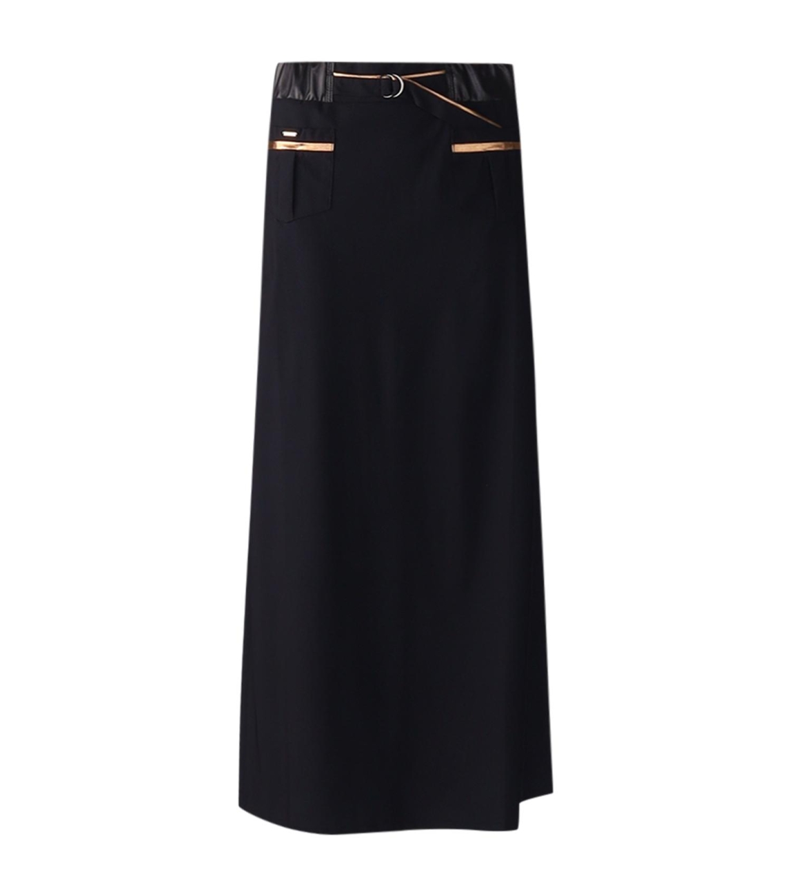 ZIP73 Long skirt W25/626/01/001. Het rechtvallend model sluit door middel van een ceintuur. Deze zwarte rok van Zip73 is voorzien van twee steekzakken en afgewerkt met bronzen details.
