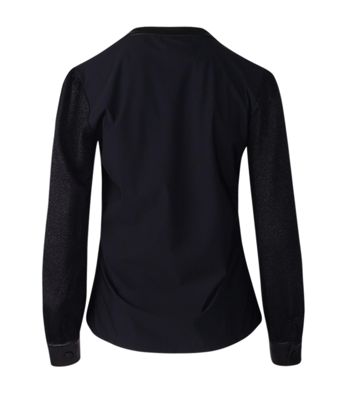 ZIP73 Top tailored collar W265/232/04/008. Het soepelvalvallend model heeft een v-hals en lange glitter-mouwen. Deze zwarte blouse van Zip73 is bewerkt met kleine logo's, leatherlook stukken en een zilveren knoopje.