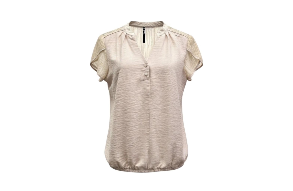 ZIP73 top Tulip Z26/115/02/255. Dit rechtvallende model heeft een V-hals met knoopsluitingen en korte mouwen. De champagnekleurige top van ZIP73 is aan de voorzijde voorzien van glitterlurex en aan de achterzijde en mouwen van een opgehaakt breisel met goudkleurige glitterdraden. Het model is afgewerkt met een elastische zoom.