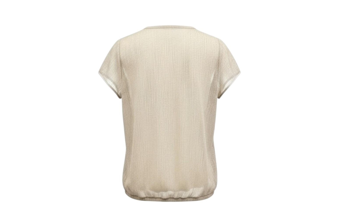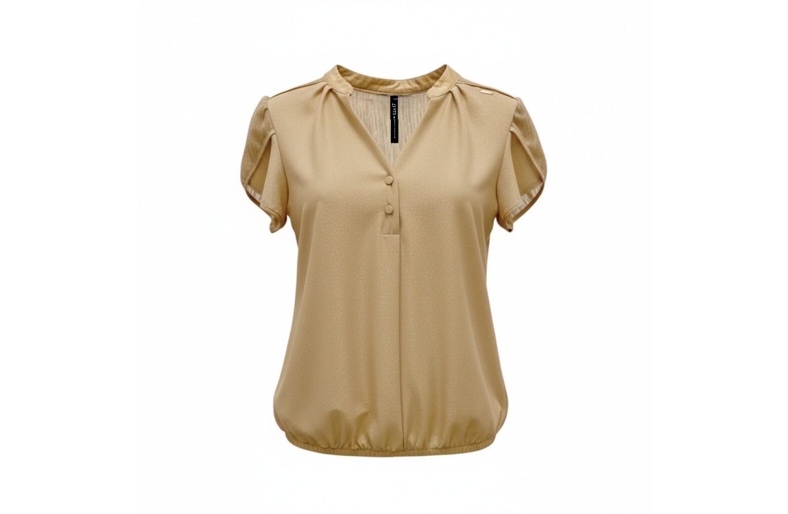 ZIP73 Top Tulip Sleeve Gold Glitter 710. Dit soepelvallend model heeft een v-hals en korte mouwen. Deze gouden top van Zip73 is voorzien van glitters en sluit aan de voorzijde door middel van knoopjes. Dit model is afgewerkt met een elastische boord aan de onderzijde.