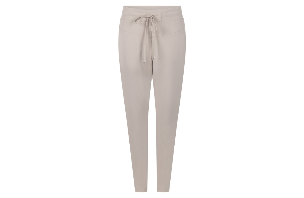 Zoso broek Amber. Dit aangesloten model sluit door middel van een elastische boord met trekkoorden. Deze zandkleurige broek van Zoso is voorzien van twee steekzakken aan de voorzijde en twee klepzakken aan de achterzijde met knoop.
