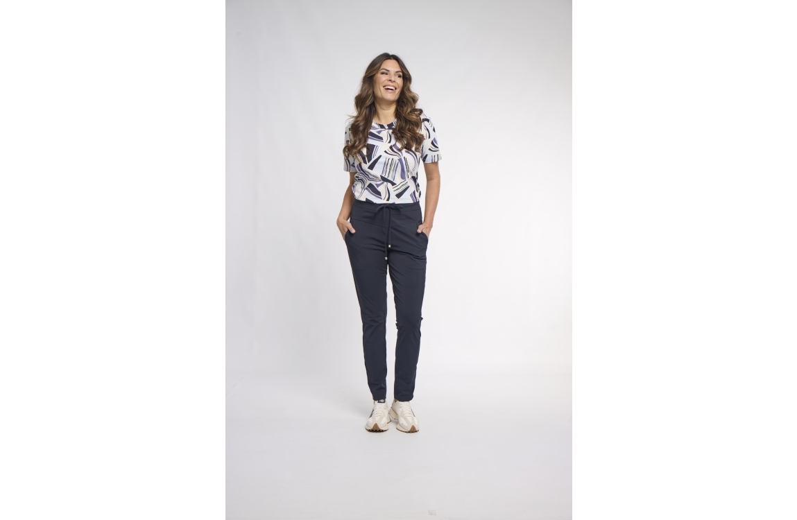 Zoso broek Amber. Dit aangesloten model sluit door middel van een elastische boord met trekkoorden. Deze navy kleurige broek van Zoso is voorzien van twee steekzakken aan de voorzijde en twee klepzakken met knoop aan de achterzijde.
