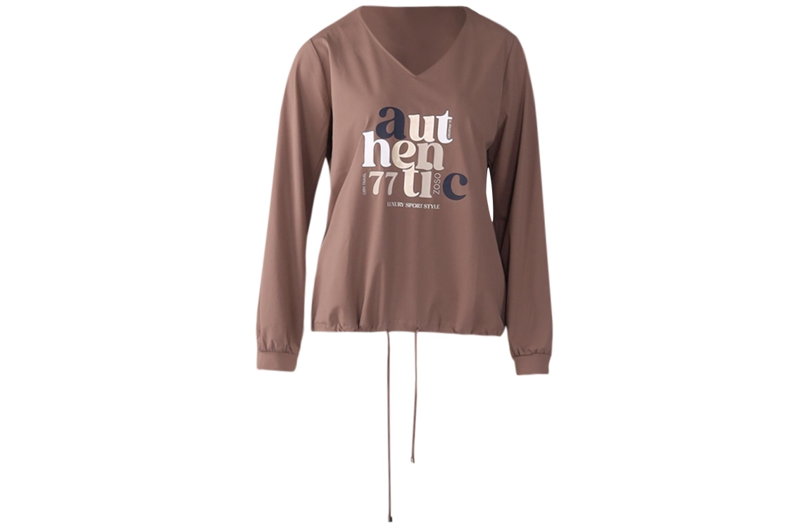Zoso shirt Audrey. Dit rechtvallend model is voorzien van een v-hals en heeft lange mouwen. Deze bruine shirt van Zoso is bewerkt met een tekstopdruk en is afgewerkt met trekkoorden aan de onderzijde.