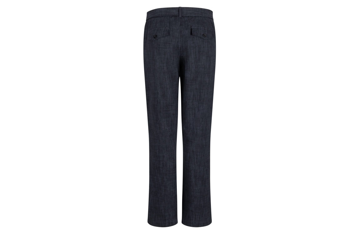 Zoso broek Belamy. Dit wide leg model sluit door middel van een elastische boord met een afneembaar ceintuur. Deze zwarte/donkerblauwe gemêleerde broek van Zoso is voorzien van twee steekzakken aan de voorzijde en twee klepzakken aan de achterzijde.