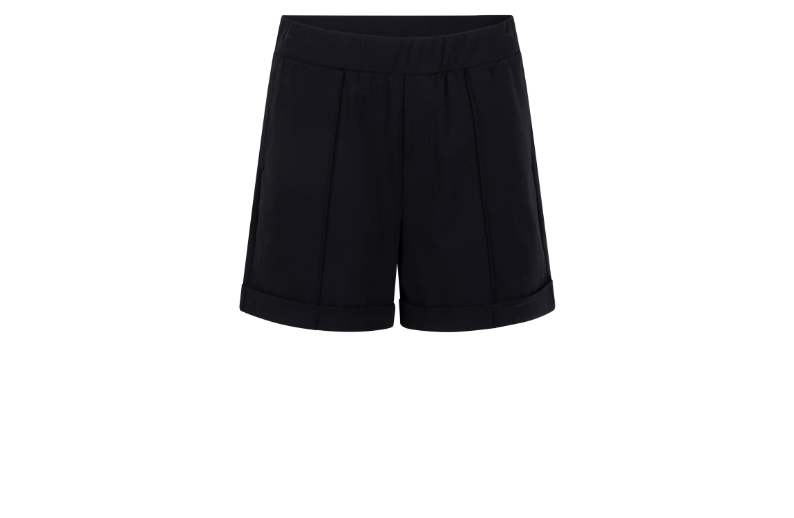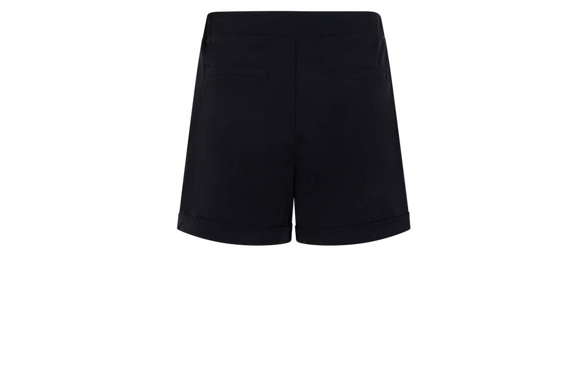 Zoso short Betty. Dit rechtvallend model sluit door middel van een elastische boord, beschikt over twee steekzakken aan de voorzijde en over twee paspelzakken aan de achterzijde. Deze zwarte short van Zoso is uitgevoerd in een travel kwaliteit