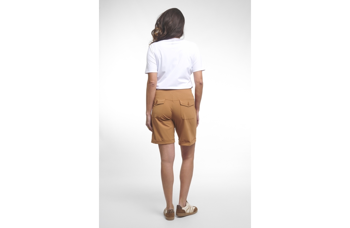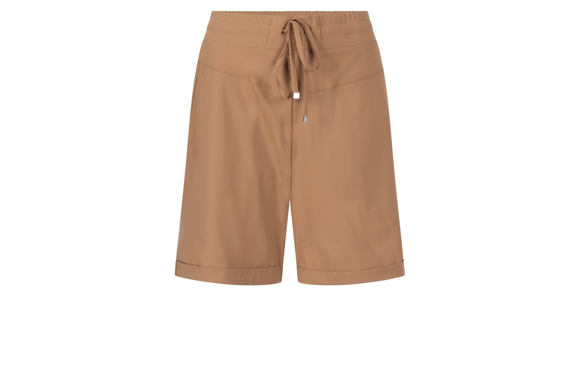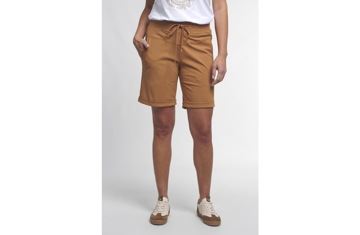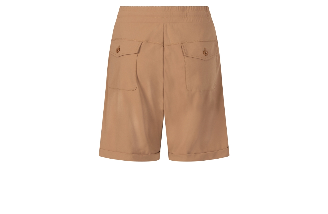 Zoso short Bowie. Dit rechtvallend model sluit door middel van een elastische boord met koord. Deze camelkleurige short van Zoso is voorzien van twee steekzakken aan de voorzijde en twee klepzakken met knoop aan de achterzijde.