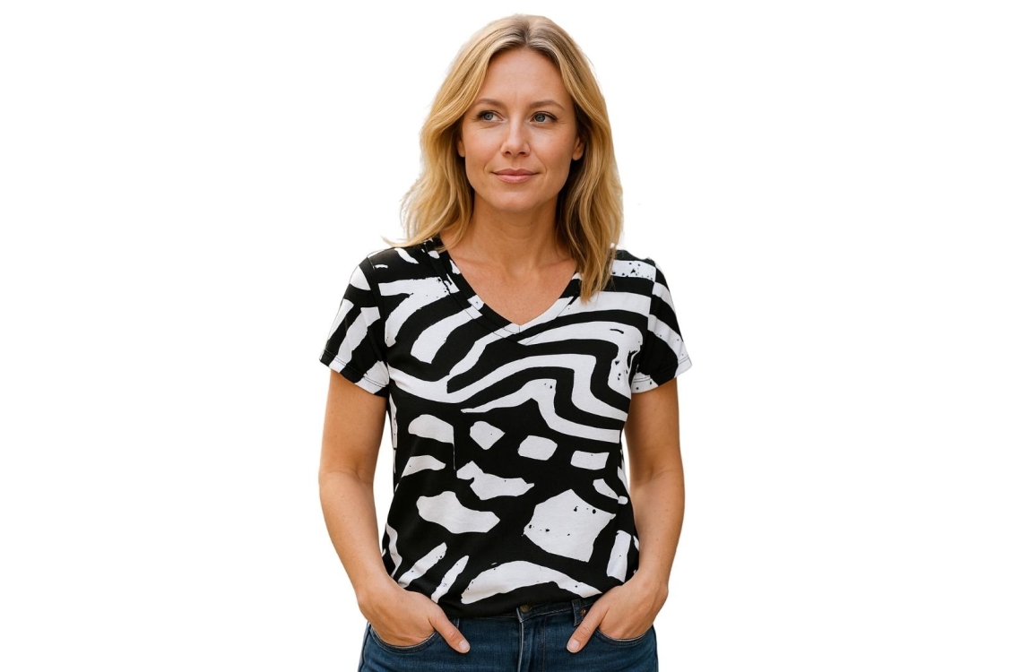 Zoso top claudia. Dit rechtvallend model is voorzien van een v-hals en heeft korte mouwen. Deze zwart/witte top van Zoso is bewerkt met een print.