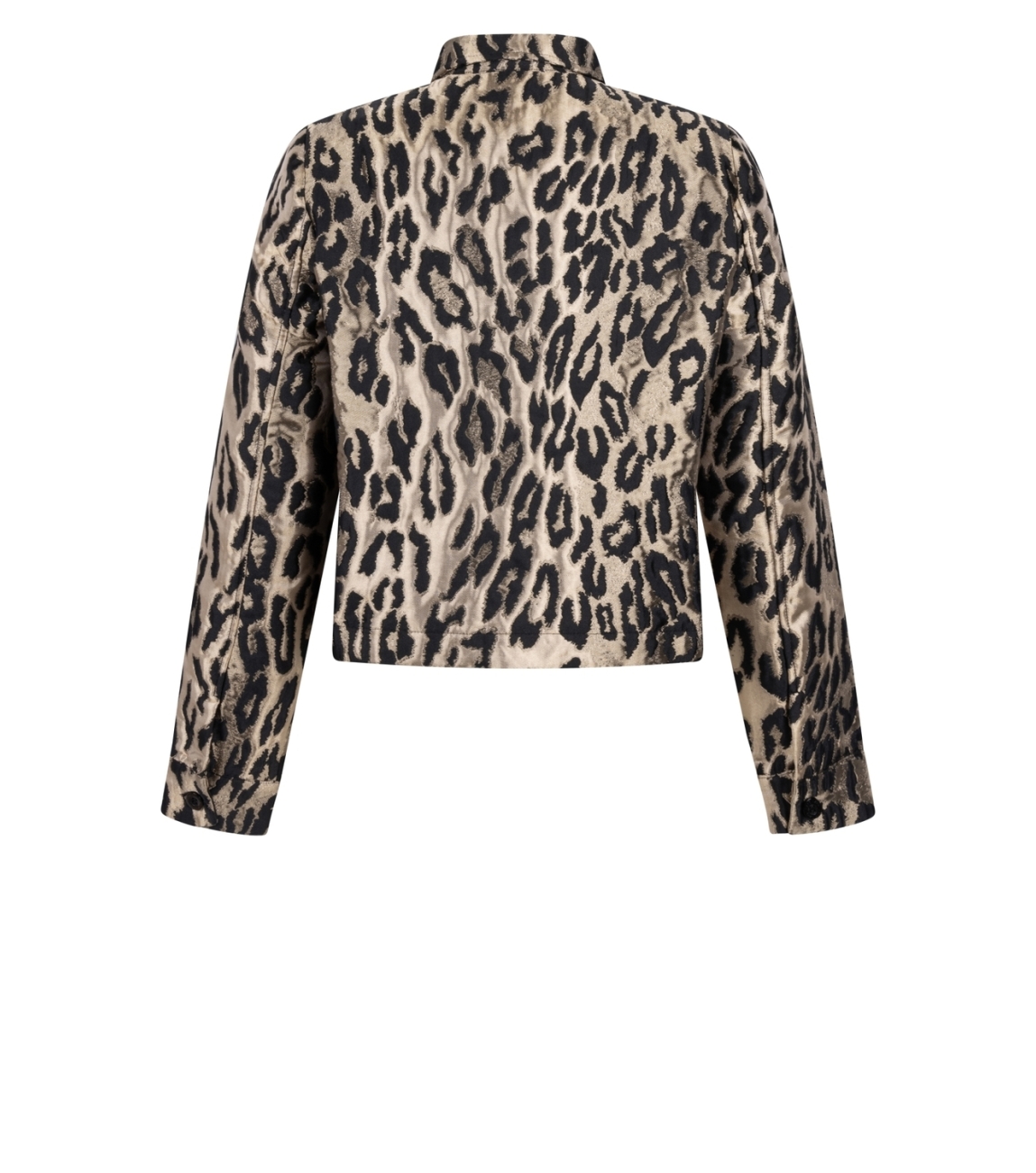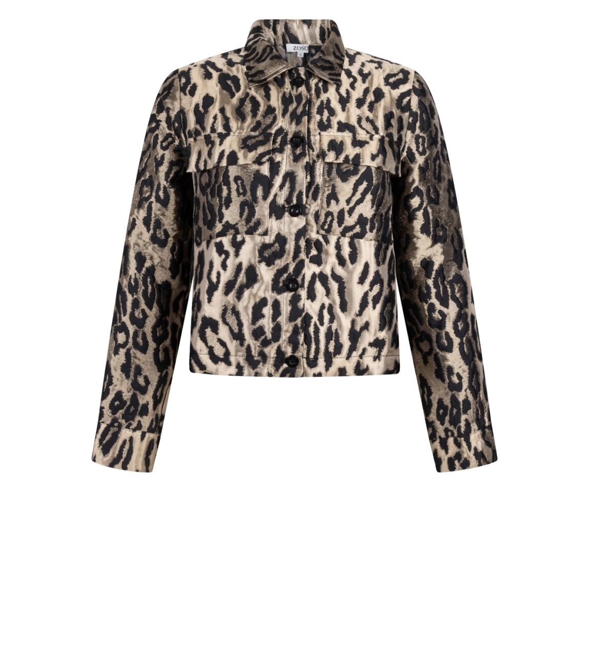 Zoso jasje Dalia. Dit rechtvallend model is voorzien van een kraag en heeft lange mouwen. Dit goudkleurige jasje van Zoso sluit door middel van knopen en is all-over bewerkt met een zwarte panterprint. Dit model beschikt over twee klepzakken.