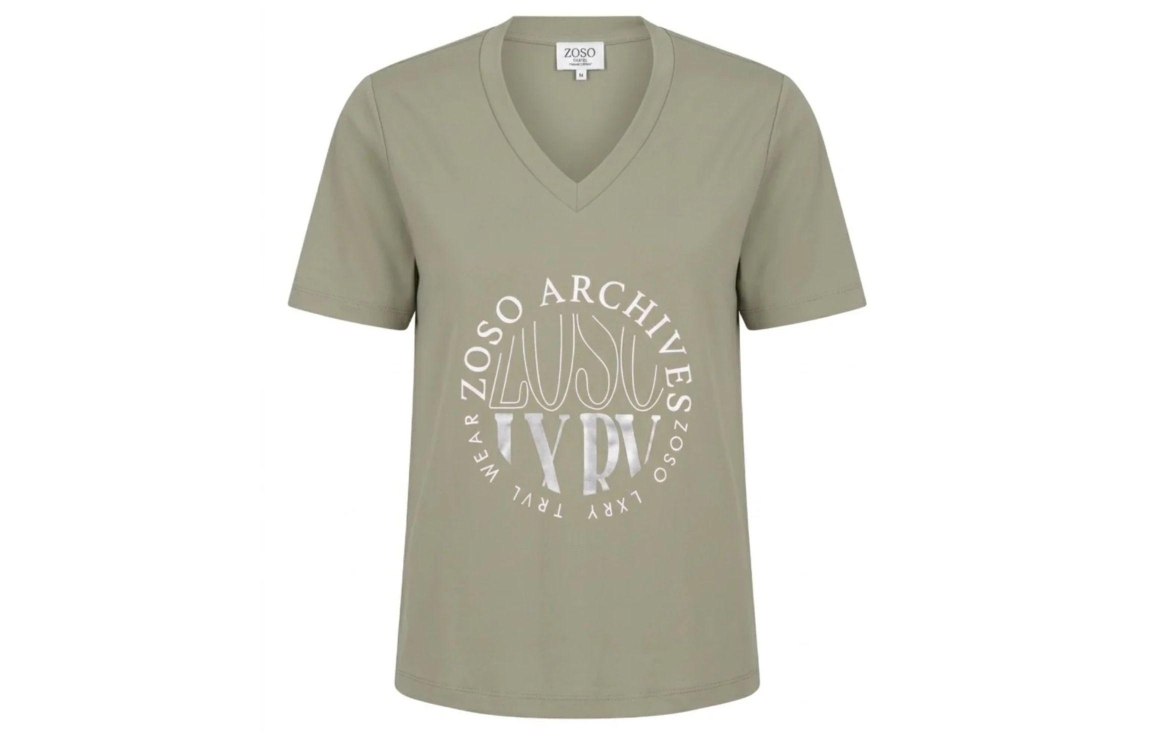 Zoso Dana 1000 sage. Dit rechtvallende model is voorzien van een V-hals en heeft korte mouwen. Deze groene top van Zoso is uitgevoerd in travelkwaliteit en is op het voorpand bewerkt met een opdruk.