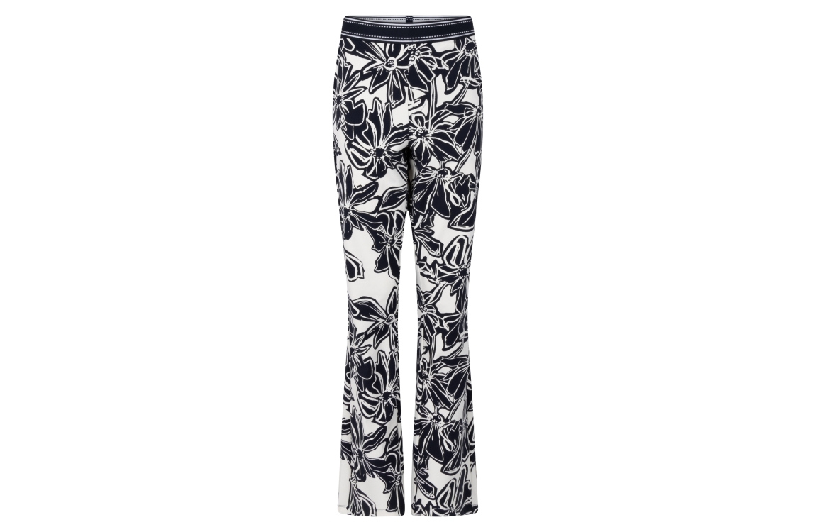 Zoso broek Devon. Dit aflared model sluit door middel van een elastische boord afgewerkt met witte accenten. Deze donkerblauwe broek van Zoso is voorzien van twee steekzakken aan de voorzijde en twee klepzakken aan de achterzijde. Dit model is afgewerkt met een bloemenprint all-over.