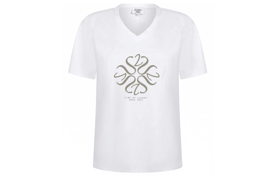 Zoso T-shirt 262Dion 00161000. Het rechtvallende model heeft een V-halslijn en korte mouwen. Dit witte top van Zoso is uitgevoerd in travelkwaliteit en is op het voorpand bewerkt met een groenkleurige (tekst)opdruk.