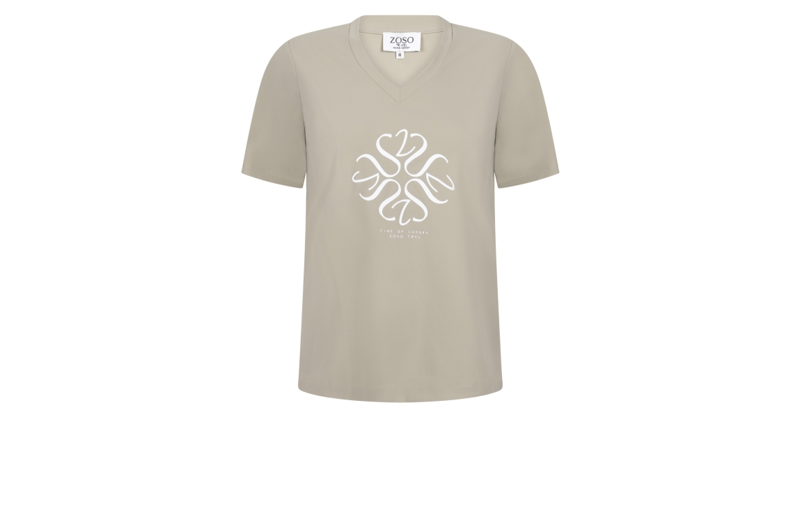 Zoso T-shirt 262Dion 1000. Het rechtvallende model heeft een V-halslijn en korte mouwen. Dit groene top van Zoso is uitgevoerd in travelkwaliteit en is op het voorpand bewerkt met een (tekst) opdruk.