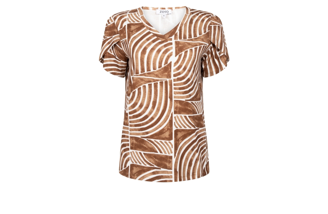 Zoso shirt Dorien. Dit rechtvallend model is voorzien van een v-hals en heeft korte mouwen. Dit roestbruine shirt van Zoso is bewerkt met een grafische print.
