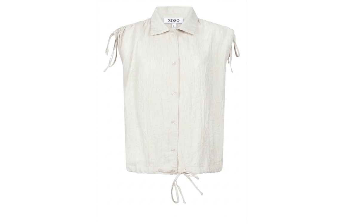 Zoso blouse Fabienne 262. Dit rechtvallend model is voorzien van een kraag met korte mouwen met draperie en trekkoorden. Deze witte blouse van Zoso sluit door middel van knopen en is all over bewerkt met subtiele structuur in dezelfde kleur als de blouse. Dit model is afgewerkt met ens elastische boord aan de onderzijde met trekkoorden.