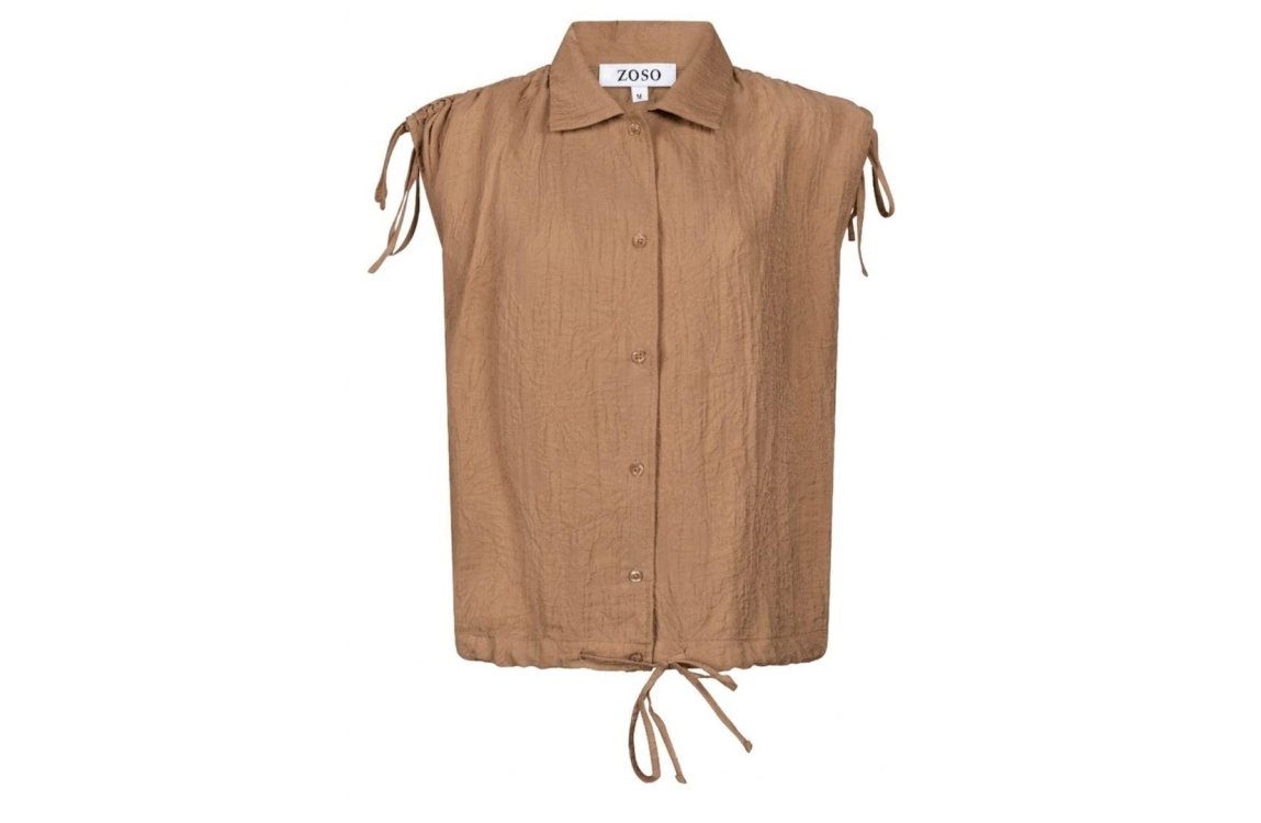 Zoso blouse Fabienne. Dit rechtvallend model is voorzien van een kraag en heeft korte mouwen met draperie en trekkoorden. Deze caramelkleurige blouse van Zoso sluit door middel van knopen en is all-over bewerkt met subtiele structuur in dezelfde kleur als de blouse. Dit model is afgewerkt met een elastische boord aan de onderzijde met trekkoorden.