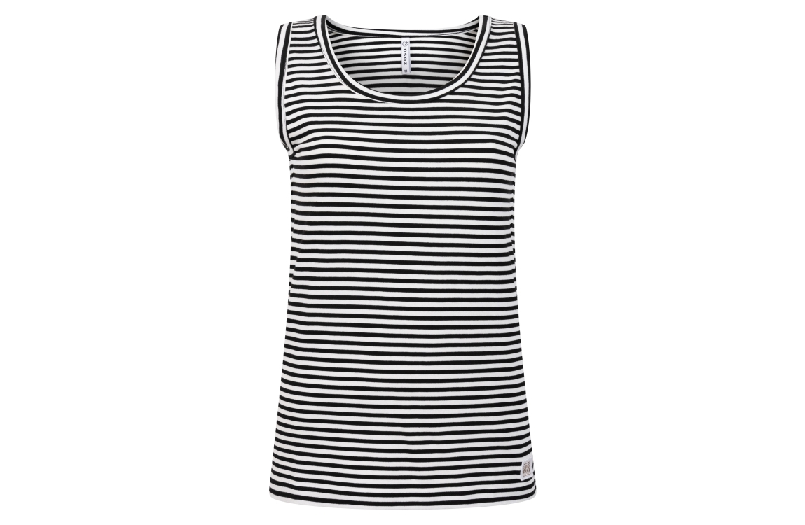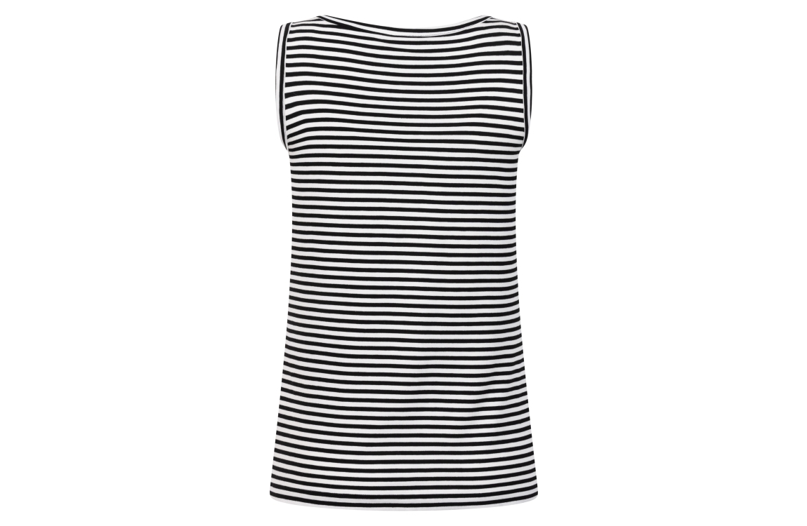 Zoso top Jaimy 253. Dit rechtvallend model heeft een diepe ronde hals en is mouwloos. Deze zwarte top van Zoso is uitgevoerd in een streeprint en stretchkwaliteit.