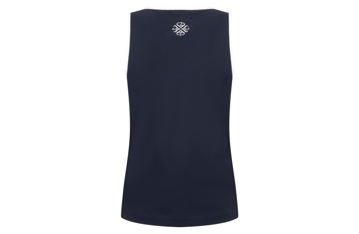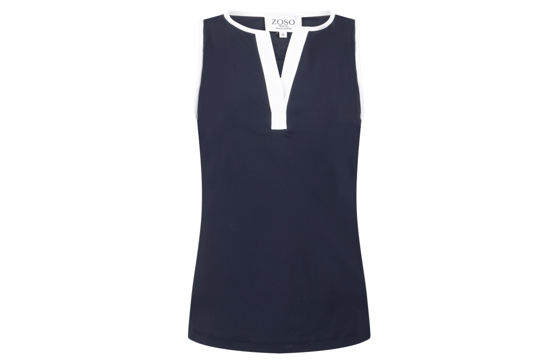 Zoso top Jessica 262. Dit soepelvalende model is voorzien van een V-hals en is mouwloos. Deze donkerblauwe Zoso top heeft een contrasterende bies.