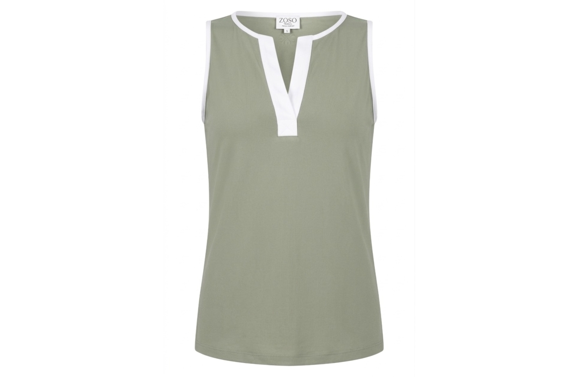 Zoso top JESSICA 262. Dit soepelvalende model is voorzien van een V-hals en is mouwloos. Deze olijfgroene top van Zoso heeft contrasterende bies.