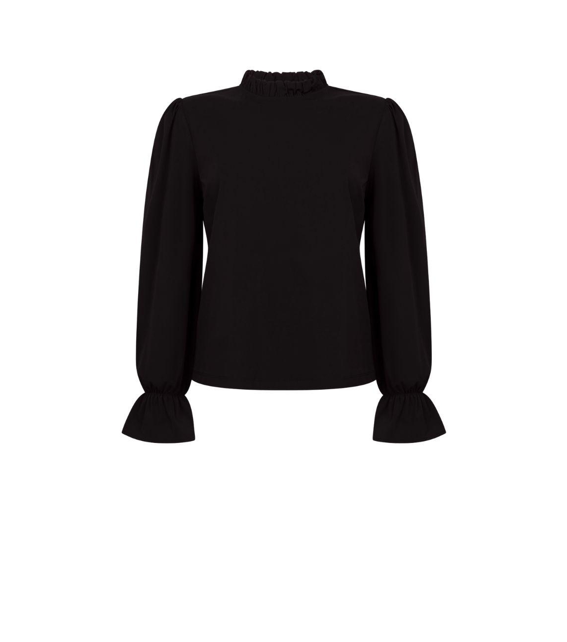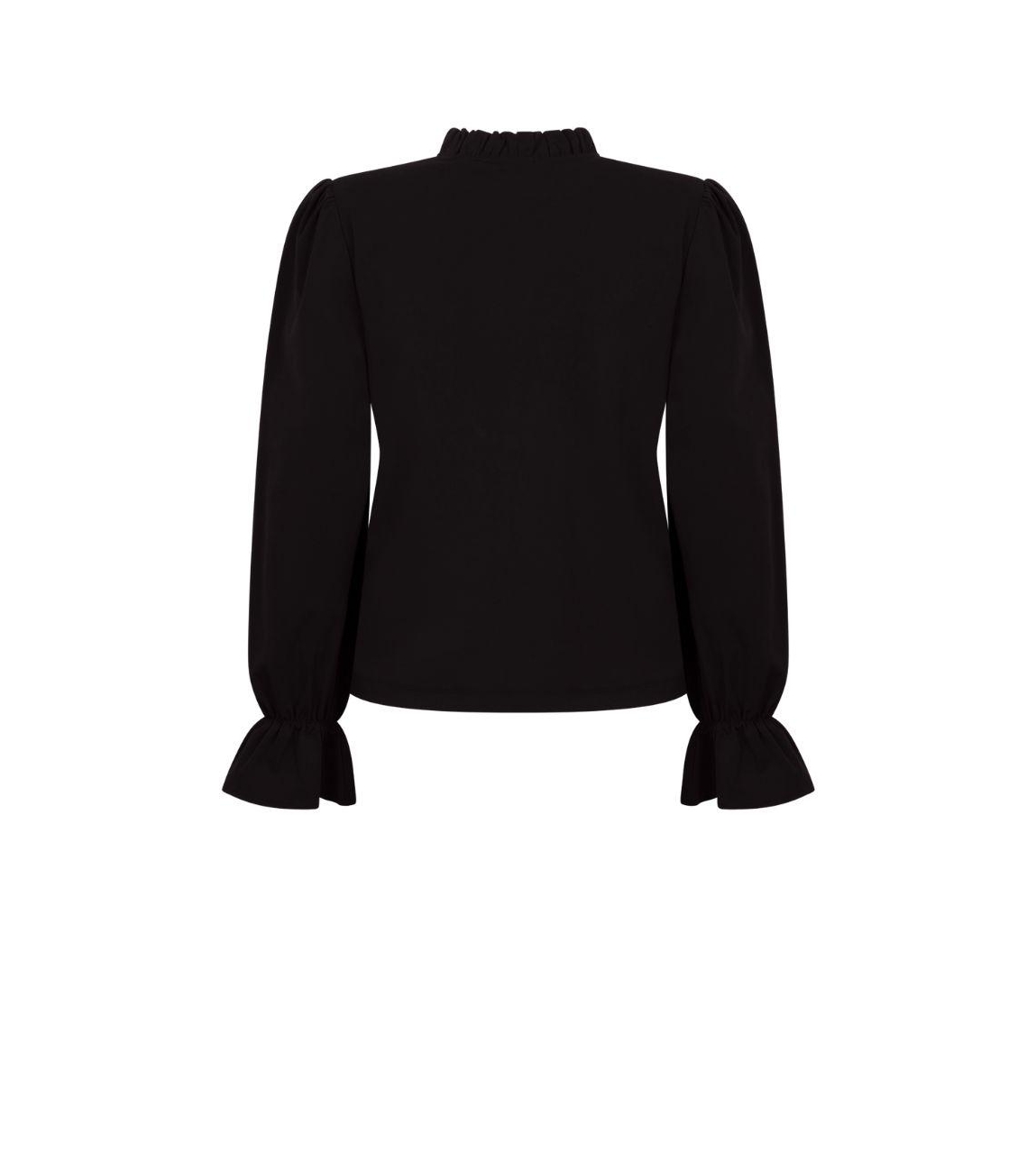Zoso blouse Jeyda. Dit zwarte rechtvallend model is voorzien van een ronde hals en heeft lange mouwen afgewerkt met ruches.