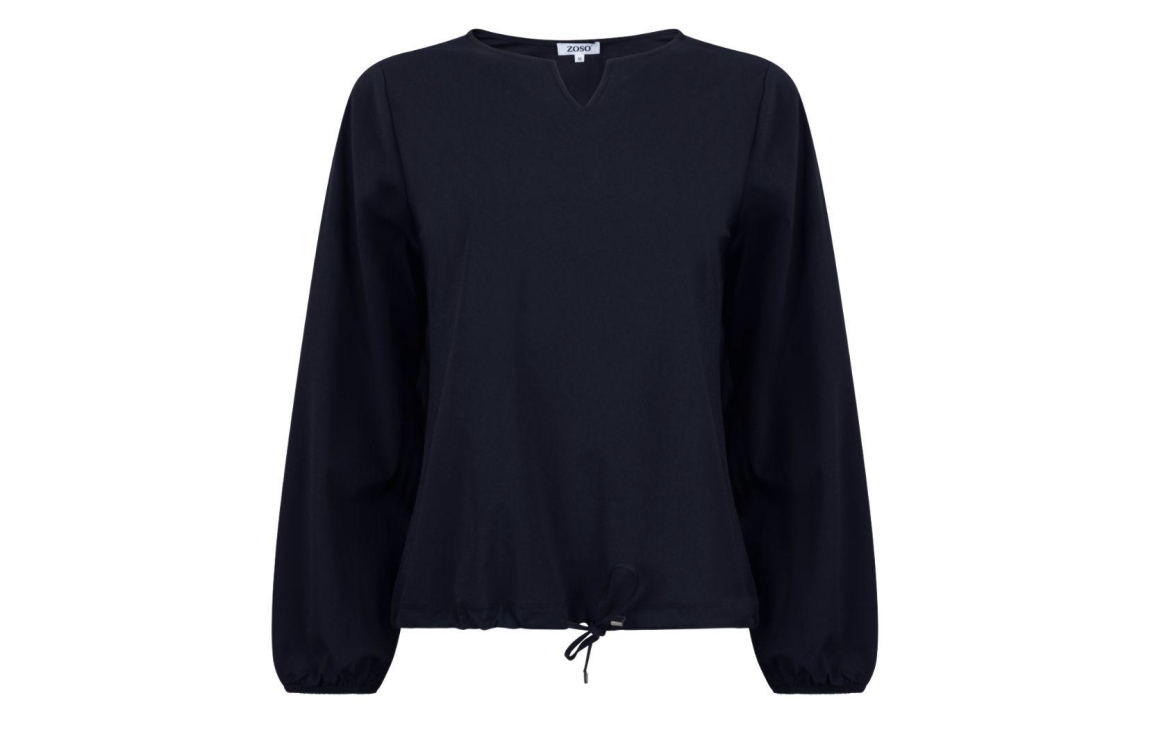 Zoso top Joan. Dit rechtvallend model is voorzien van een ronde hals met v-inkeping en heeft lange mouwen afgewerkt met elastische boorden. Deze donkerblauwe top van Zoso beschikt over trekkoorden aan de onderzijde.