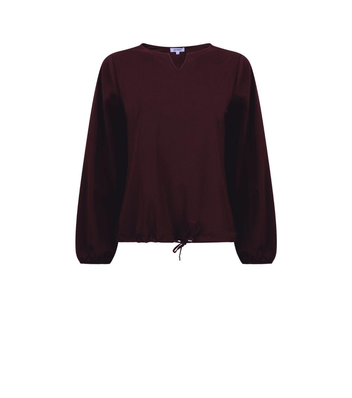 Zoso shirt Joan. Dit rechtvallend model is voorzien van een ronde hals met v-inkeping en heeft lange mouwen. Dit bordeauxrode shirt van Zoso beschikt over elastische boorden en een trekkoord aan de onderzijde.