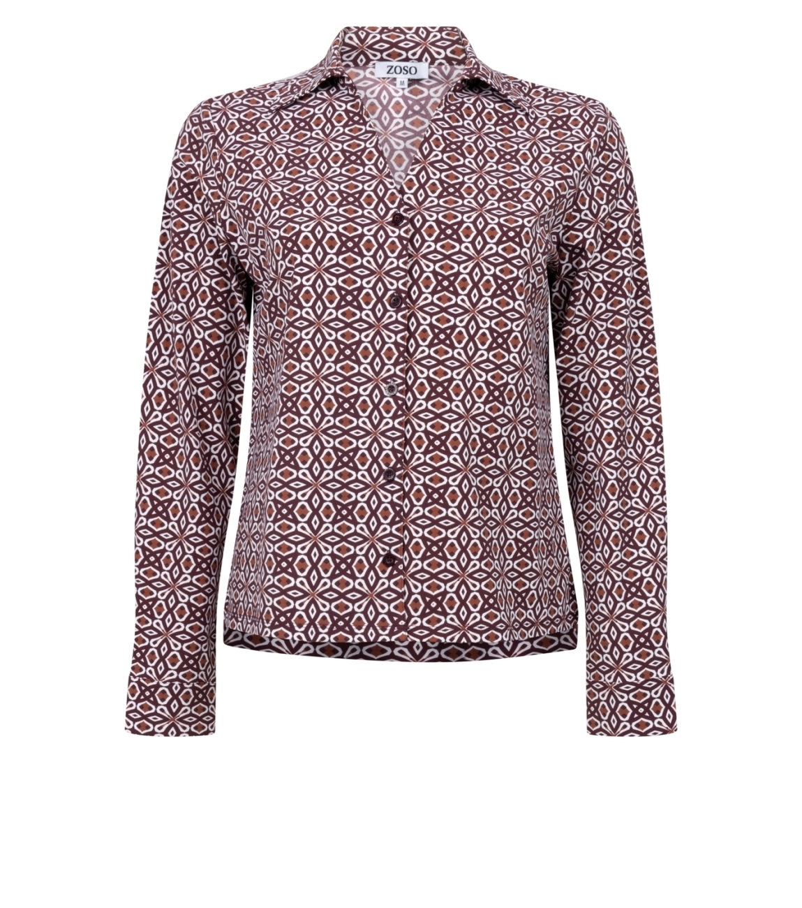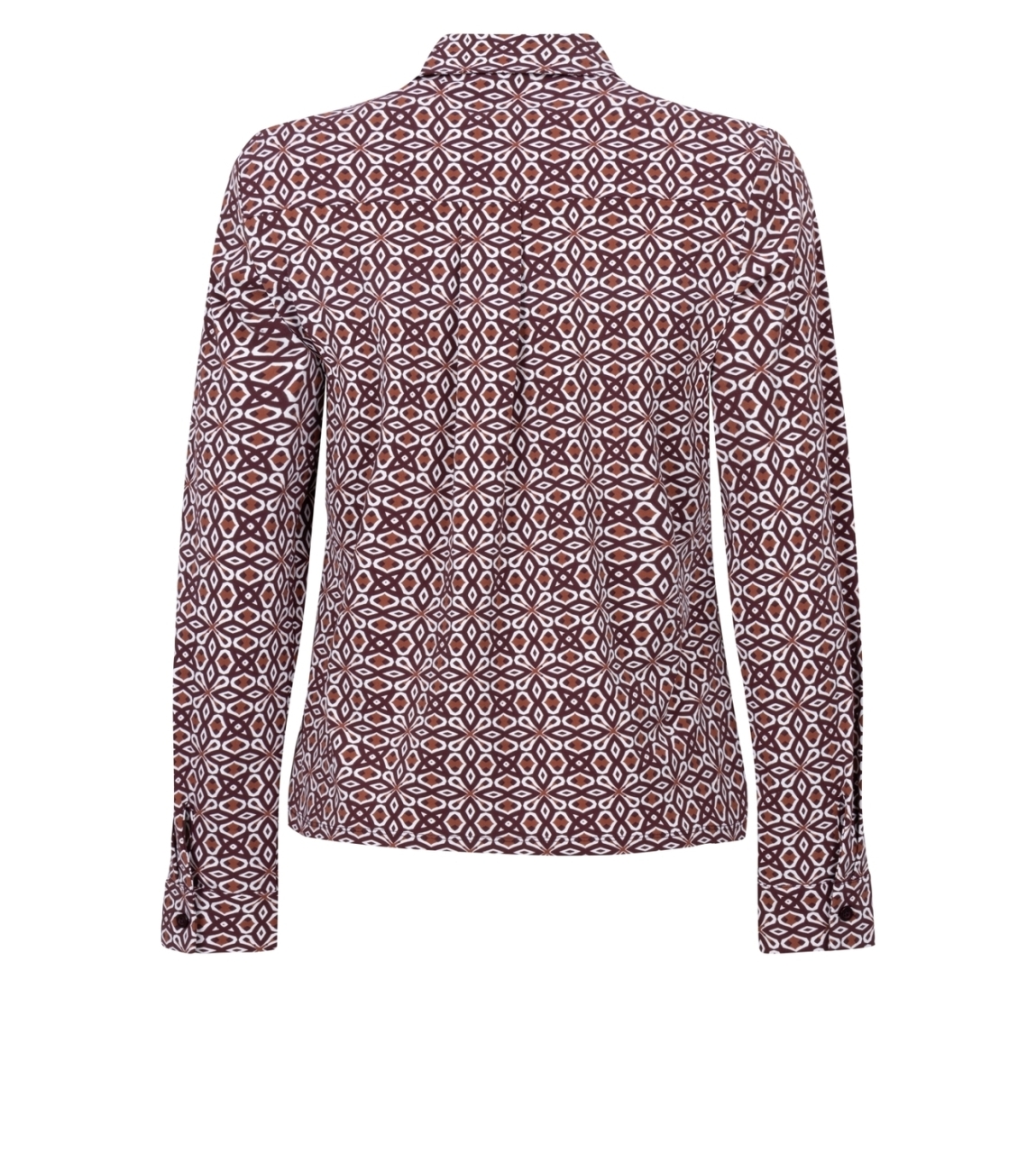 Zoso blouse Jolene. Dit rechtvallend model is voorzien van een kraag en heeft lange mouwen. Deze witte/bordeaux kleurige blouse van Zoso sluit door middel van knopen en is all-over bewerkt met een grafische print.