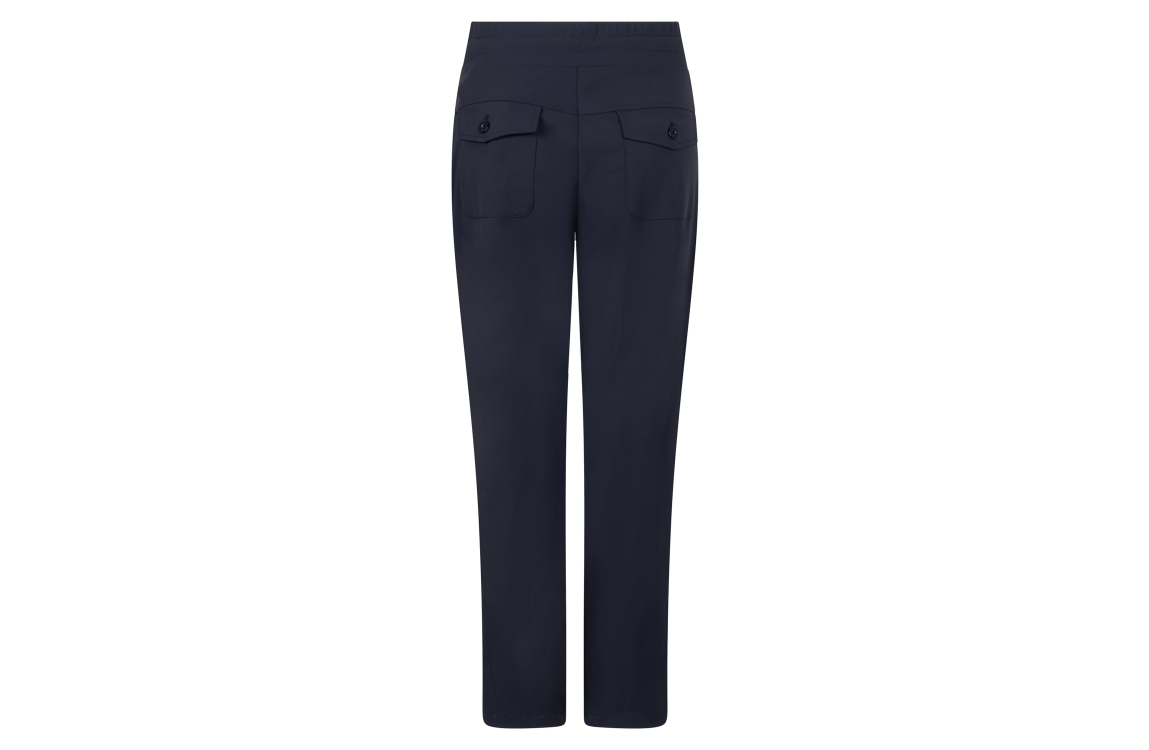 Zoso broek Joy. Dit aangesloten model sluit door middel van een elastische boord met trekkoorden. Deze donkerblauwe broek van Zoso is voorzien van twee steekzakken aan de voorzijde en twee klepzakken aan de achterzijde met knoop.