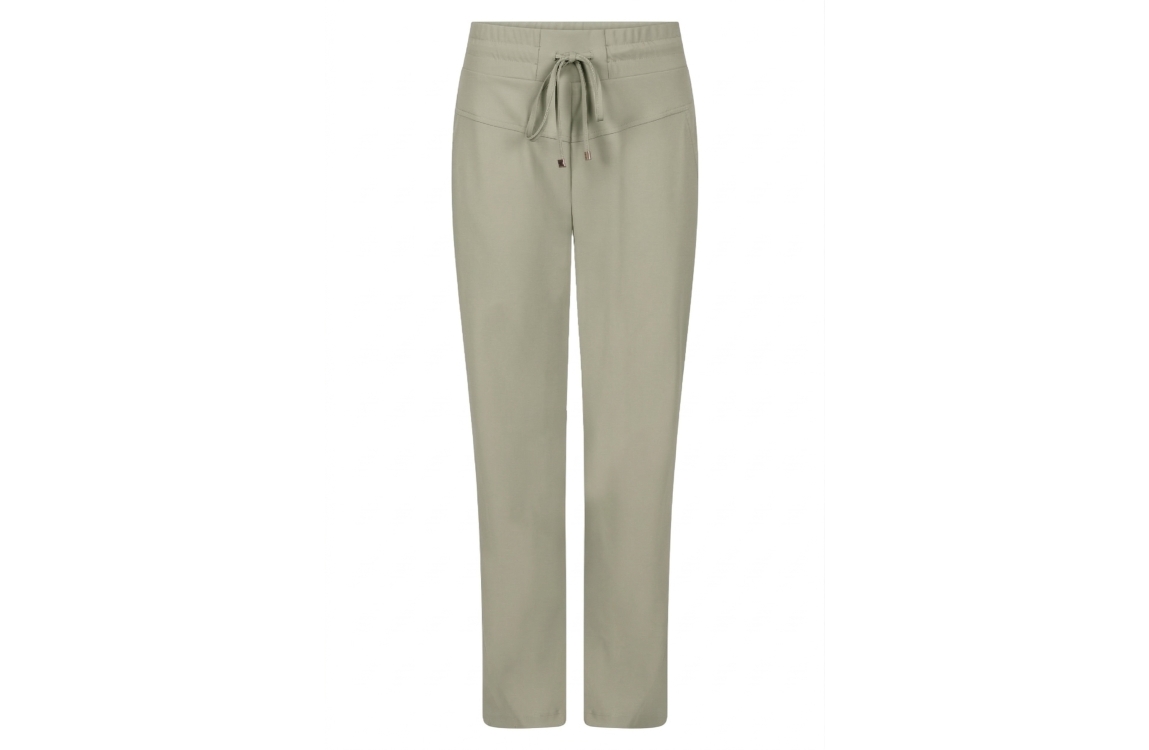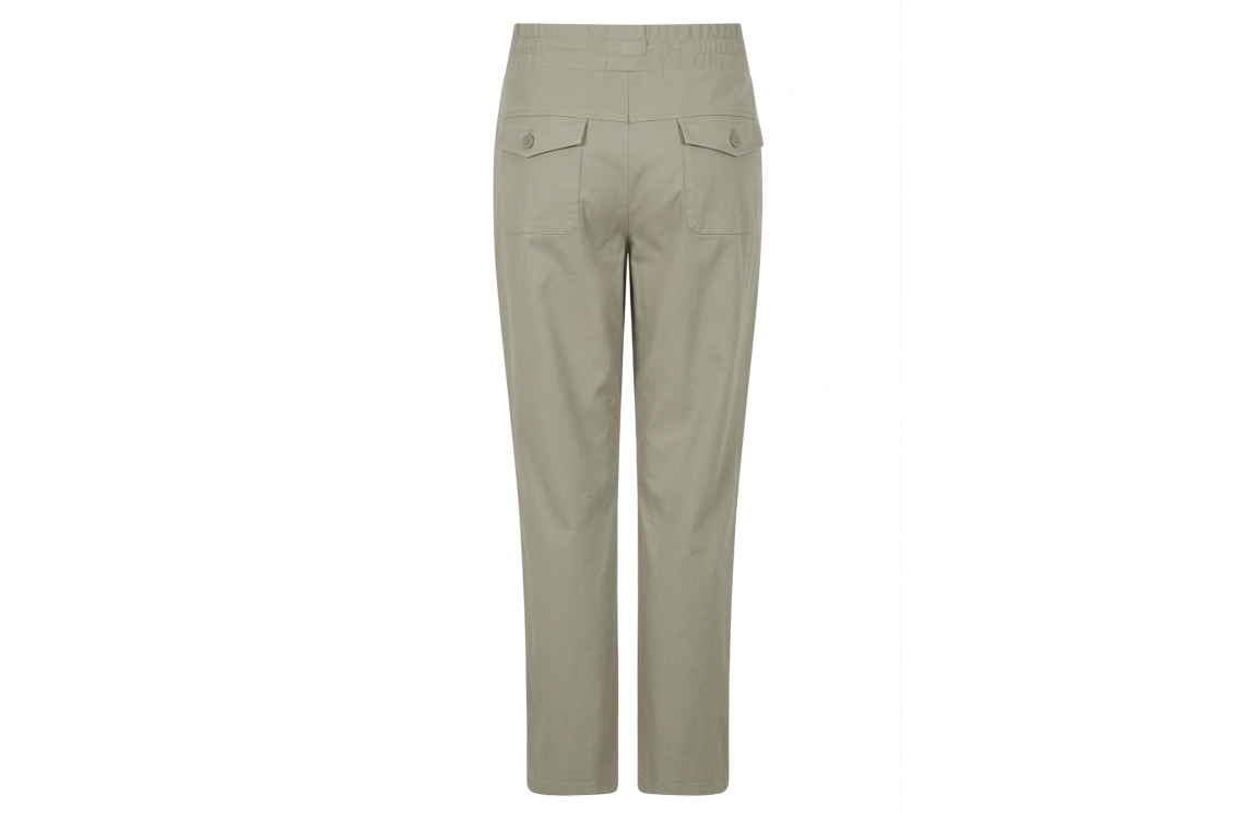 Zoso broek Joy. Dit aangesloten model sluit door middel van een elastische boord met trekkoorden. Deze groene broek van Zoso is voorzien van twee steekzakken aan de voorzijde en twee klepzakken aan de achterzijde met knoop.