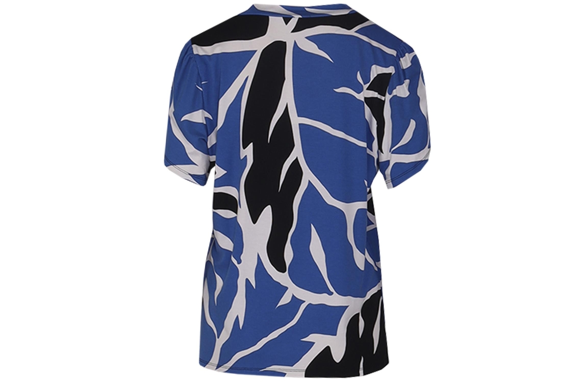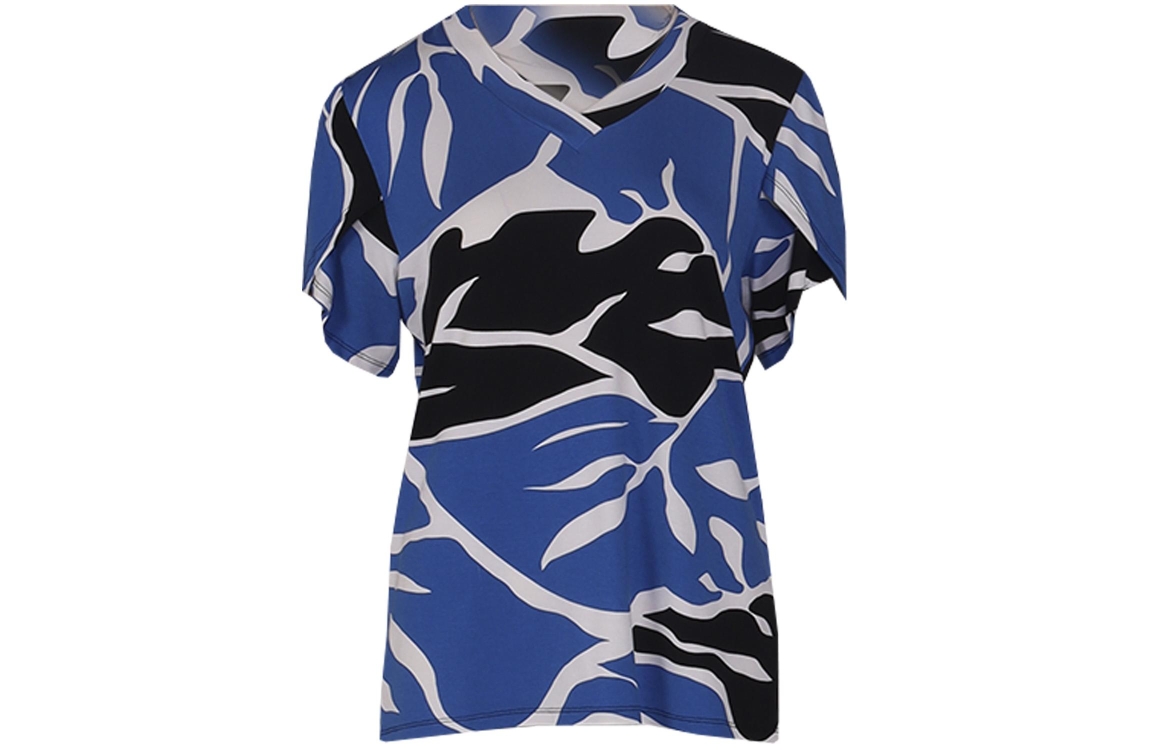 Zoso top June. Dit rechtvallend model is voorzien van een v-hals en heeft korte mouwen. Deze blauw/zwart/witte top van Zoso is bewerkt met een grafische print.