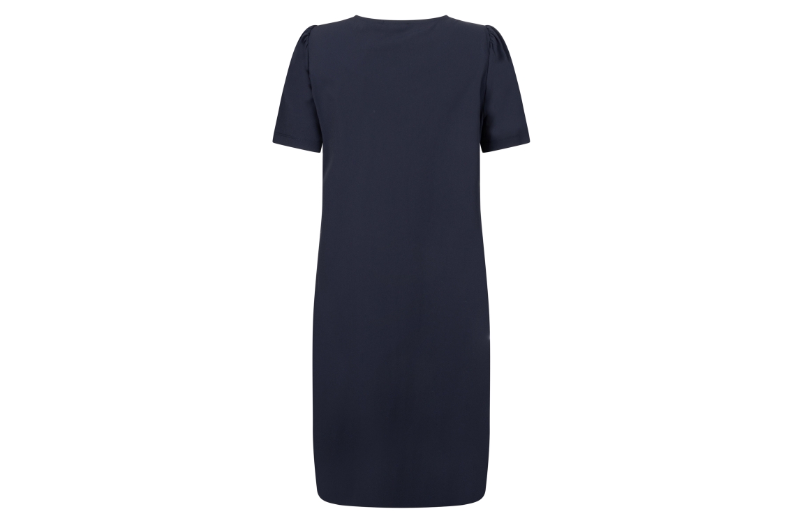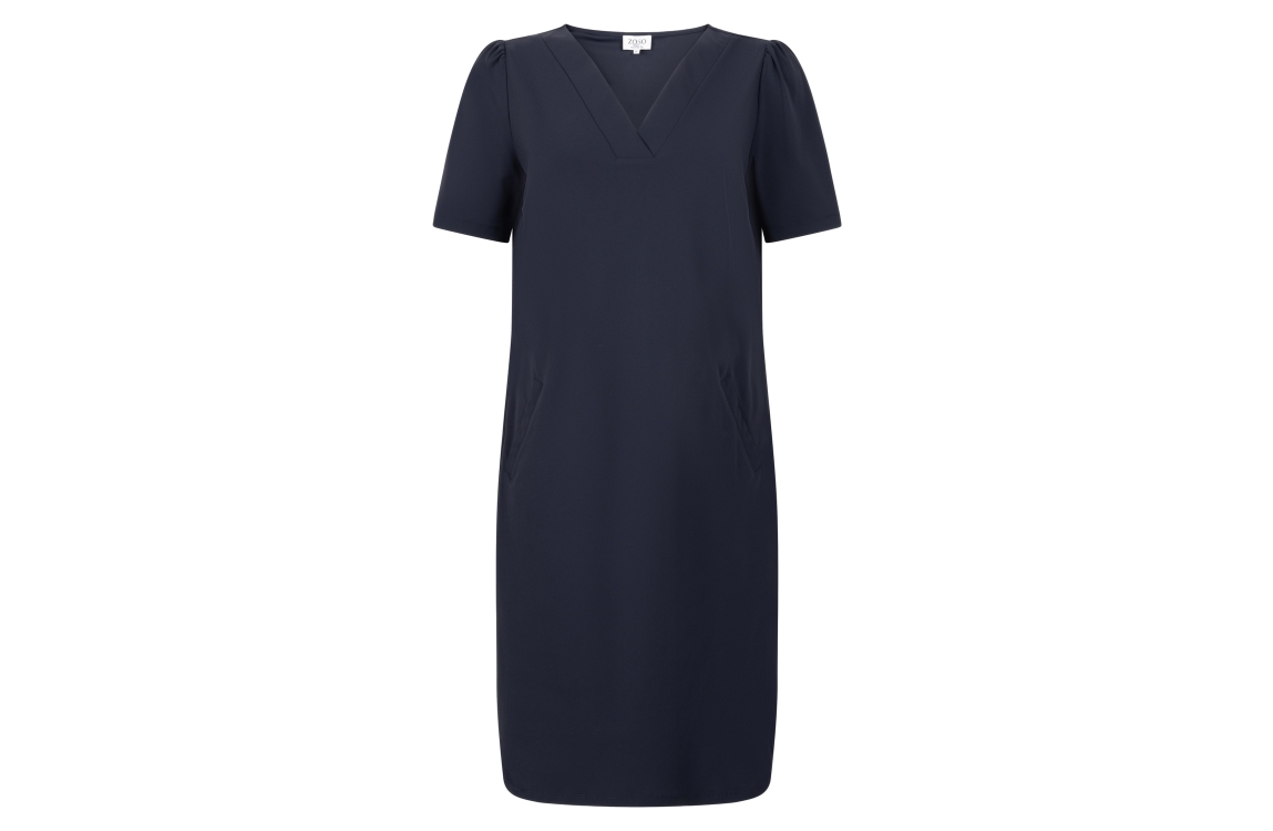 Zoso jurk Juulz. Dit rechtvallend model is voorzien van een v-hals en heeft korte mouwen. Deze donkerblauwe jurk van Zoso beschikt over twee steekzakken.