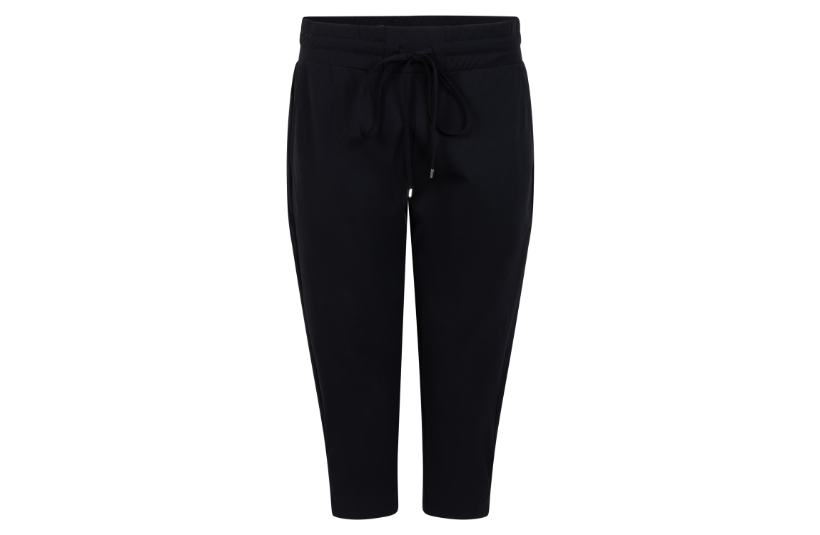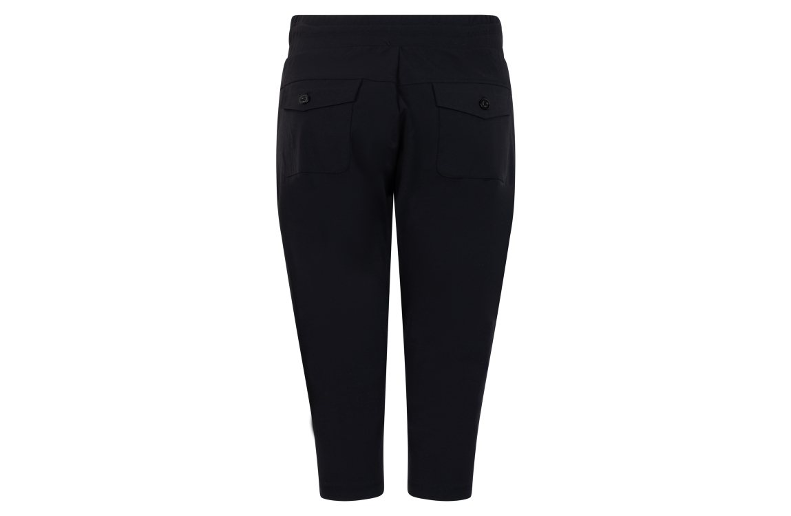 Zoso broek Linda. Dit rechtvallend model sluit door middel van een elastische tailleband met trekkoorden. Deze zwarte travel driekwart broek is voorzien van twee steekzakken aan de voorzijde en twee klepzakken aan de achterzijde.