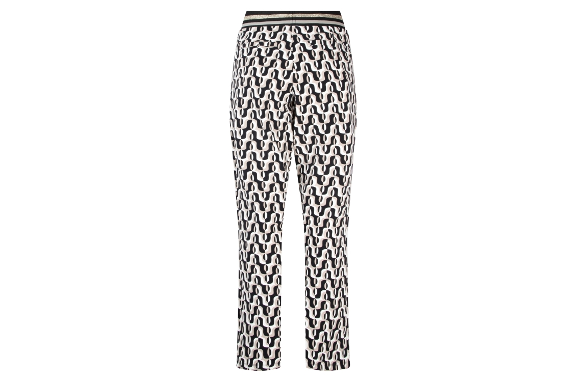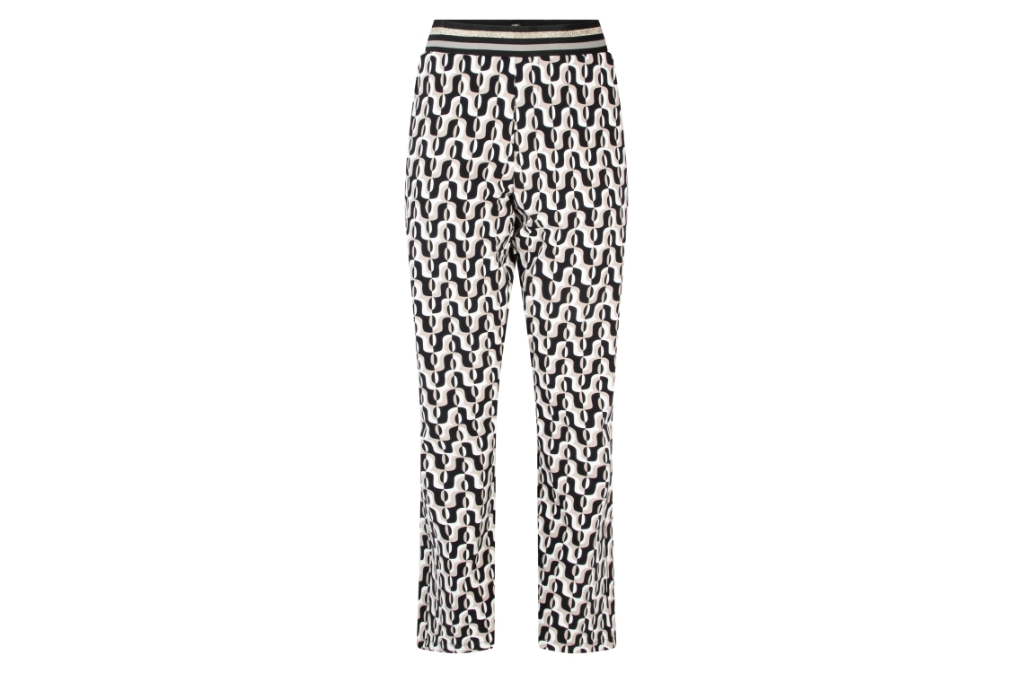 Zoso broek Maggy. Dit rechtlopende model is voorzien van een elastische tailleband en heeft lange pijpen. Deze beige broek van Zoso is bewerkt met een all-over retroprint en is afgewerkt met schuine steekzakken aan de voorzijde en twee paspelzakken aan de achterzijde. De elastische band is voorzien van een metallic- en grijze bies en dit model is uitgevoerd in een travel kwaliteit.