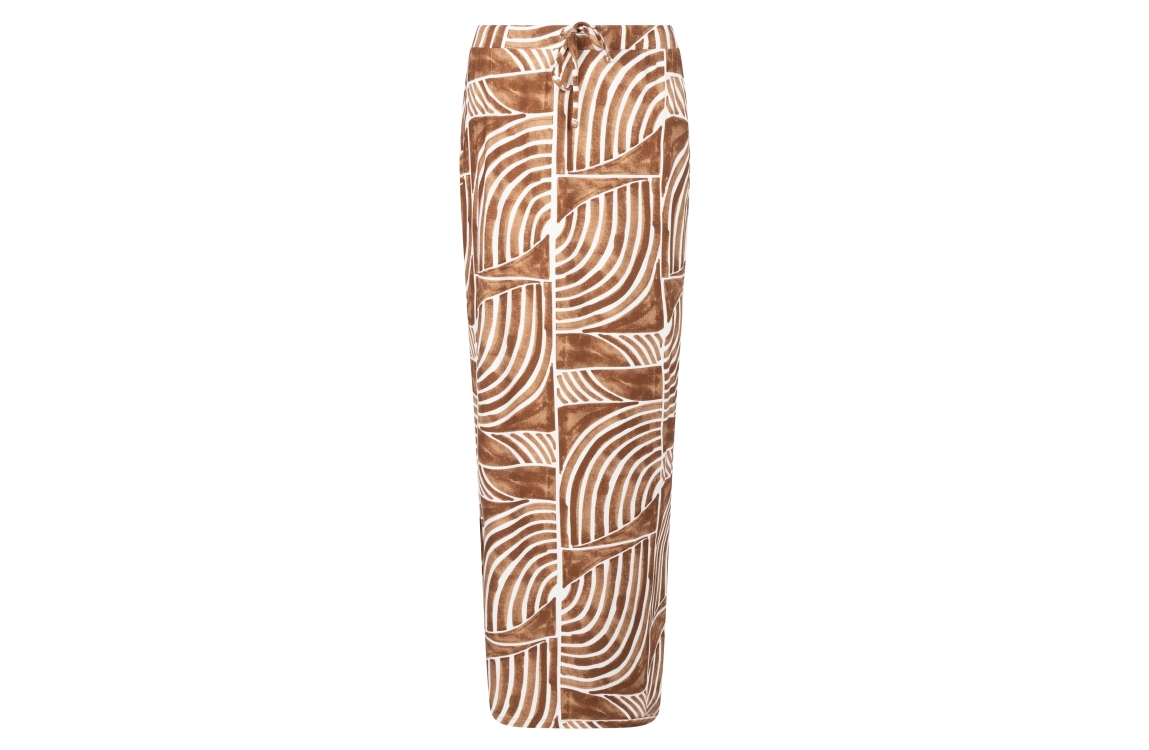 Zoso rok Maggy. Dit rechtvallend model sluit door middel van een elastische boord met trekkoord. Deze roestbruine rok van Zoso is bewerkt met een grafische print.