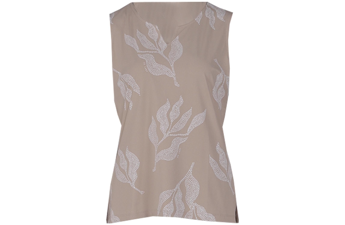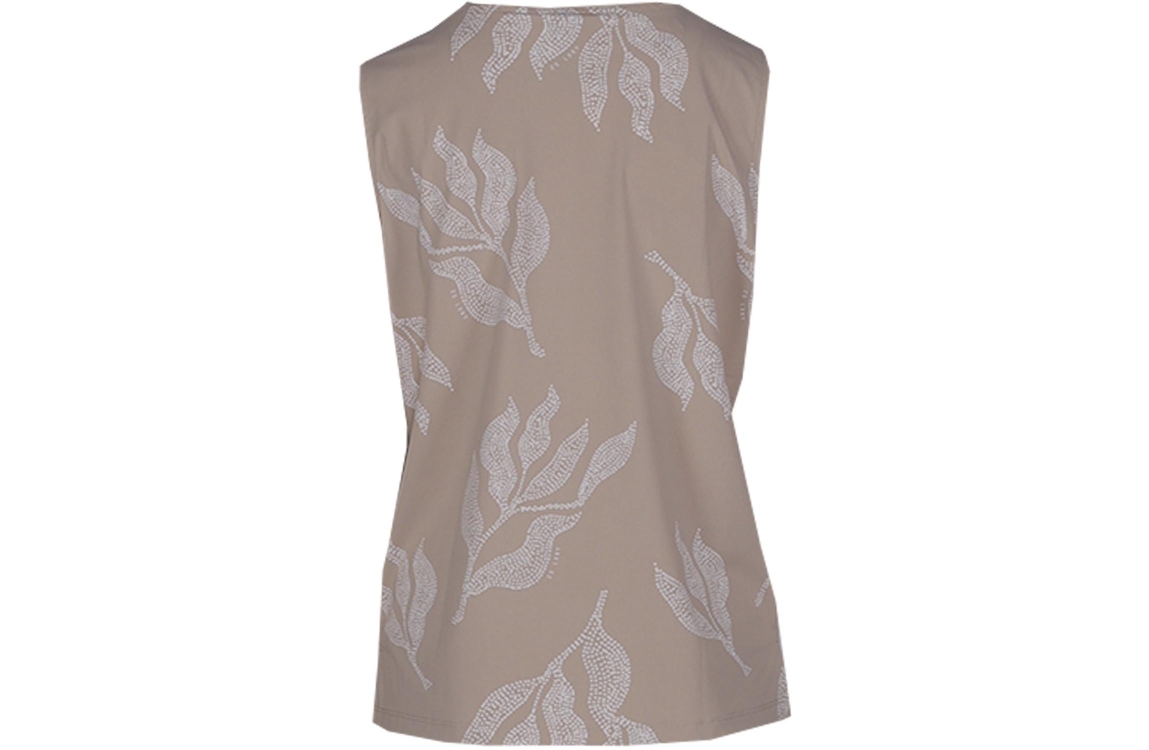 Zoso top Marcella. Dit rechtvallend model is voorzien van een ronde hals met v-inkeping en is mouwloos. Deze beige travel top van Zoso is bewerkt met een witte bladprint.