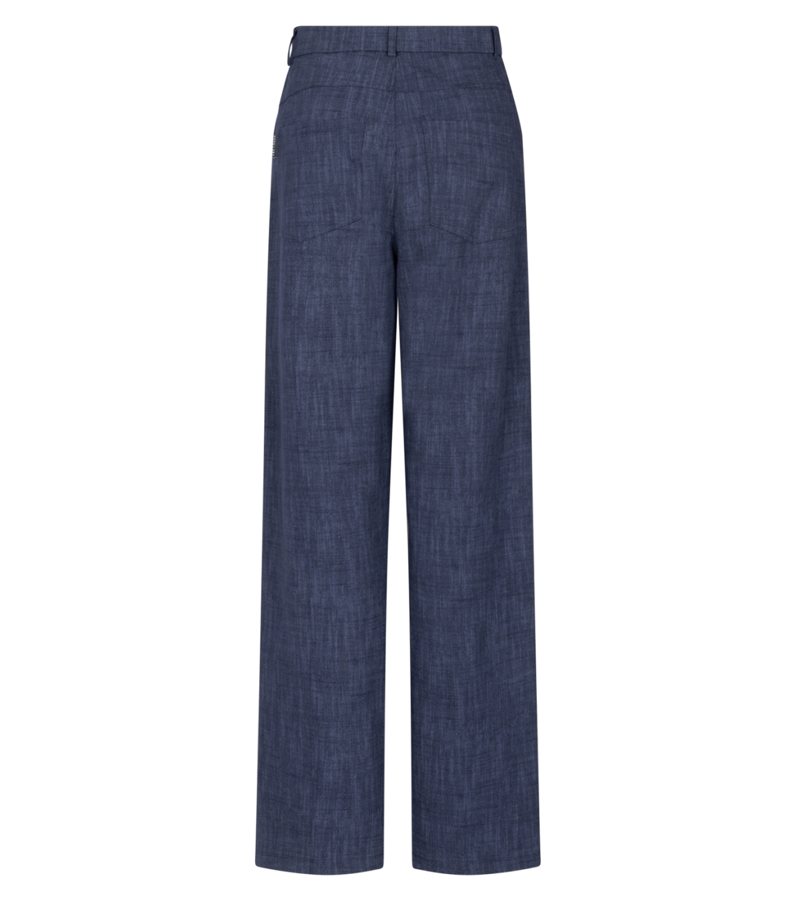 Zoso broek 254Megan. Dit rechtvallend model sluit door middel van een knoop en ritsaansluiting en heeft ceintuurlussen. Deze donker blauwe Zoso broek beschikt over twee steekzakken aan de voor- en achterzijde.
