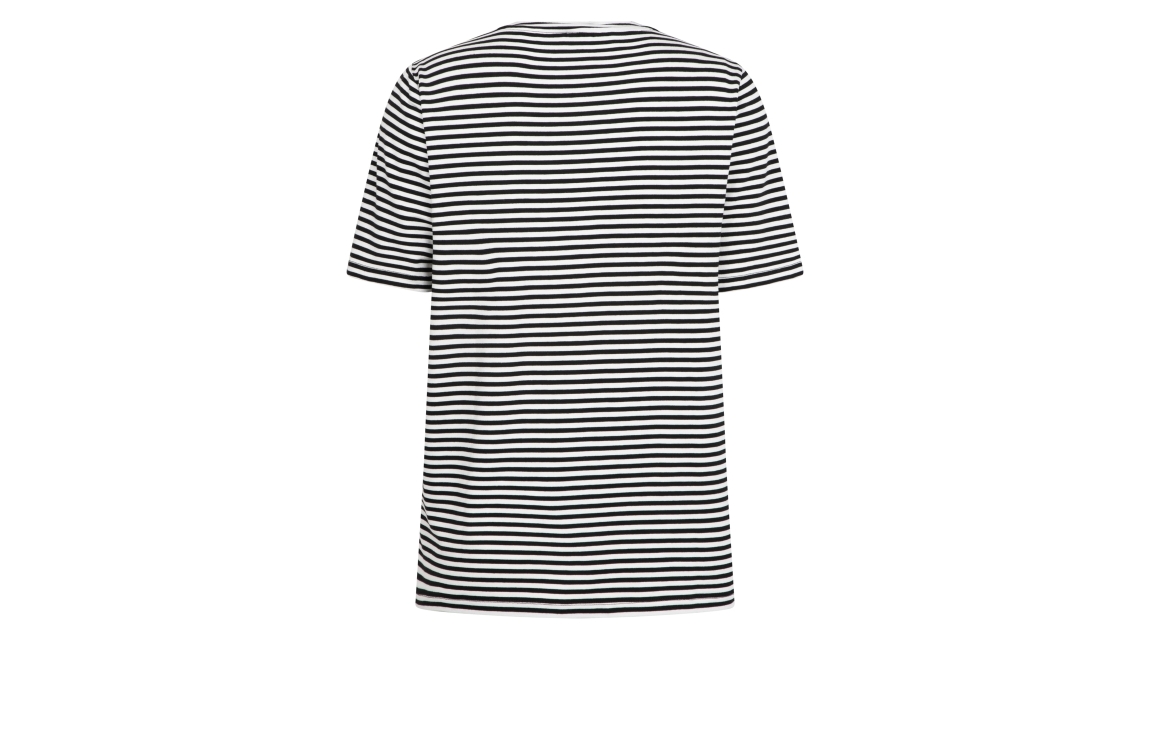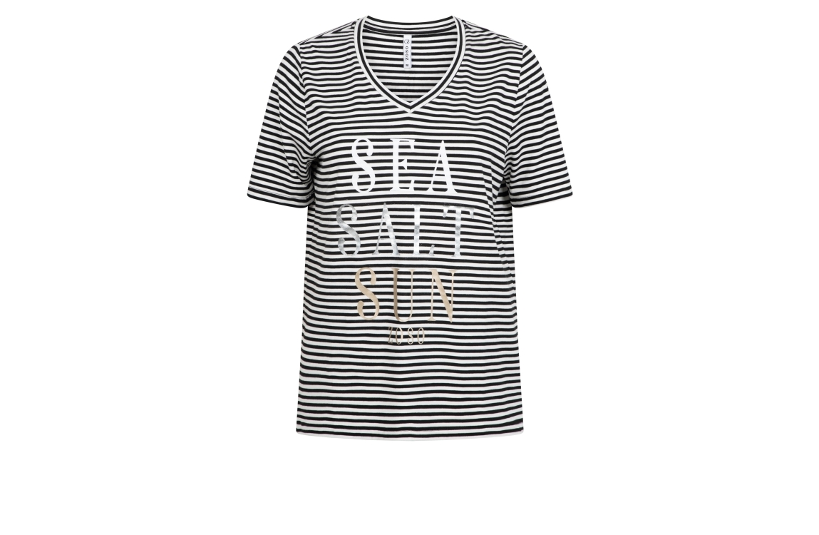 Zoso T-shirt 353 Merel. Dit rechtvallend model heeft een V-hals en korte mouwen. Deze zwarte T-shirt van Zoso is uitgevoerd in een streepprint en stretchkwaliteit. Het model is op het voorpand bewerkt met een letteropdruk in verschillende kleuren en heeft afgewerkte boorden.