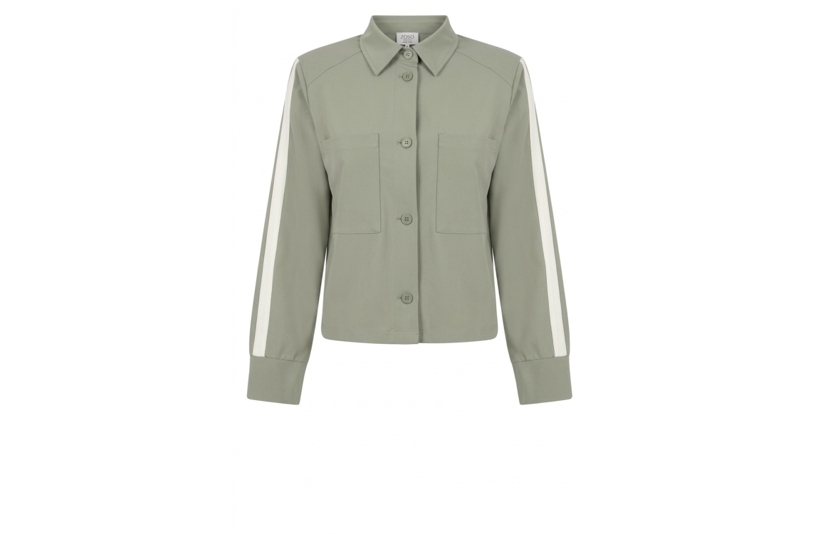 Zoso vest MICHELLE262. Dit rechtvallende model sluit door middel van knopen en heeft een blousekraag. Deze olijfgroene vest van Zoso is afgewerkt met een witte bies langs beide mouwen. Dit model is voorzien van twee steekzakken aan de voorzijde.