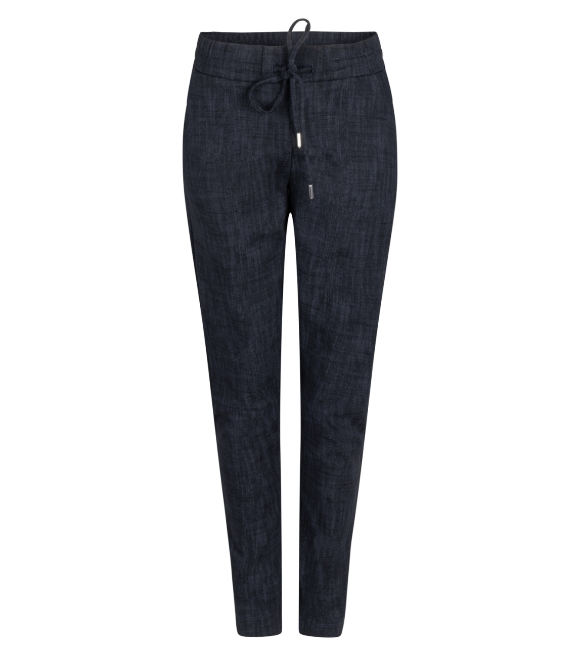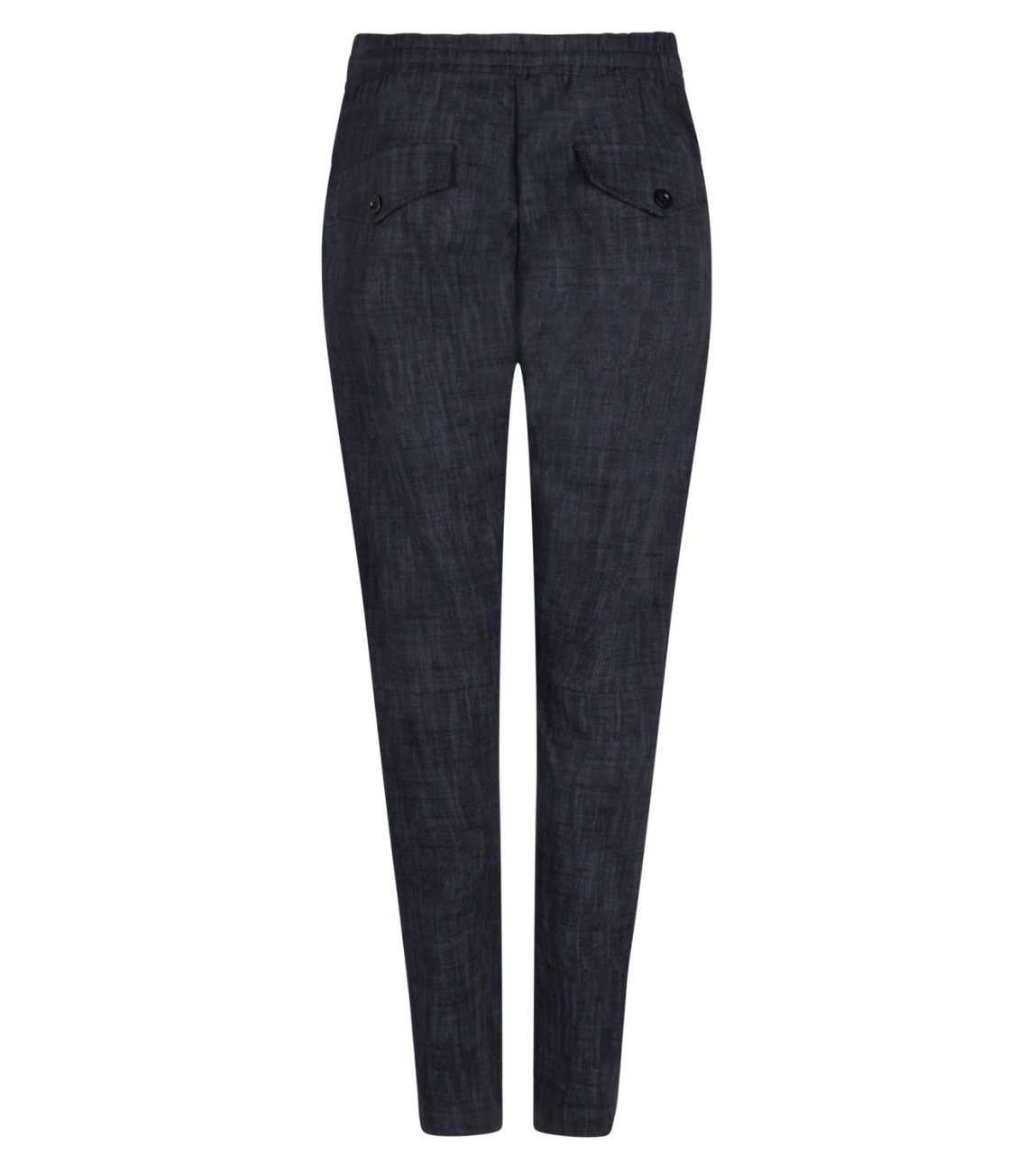 Zoso broek Nadine. Dit aangesloten model sluit door middel van een elastische boord met trekkoorden. Deze zwarte/donkerblauwe gemêleerde broek van Zoso is voorzien van twee steekzakken aan de voorzijde en twee klepzakken aan de achterzijde.