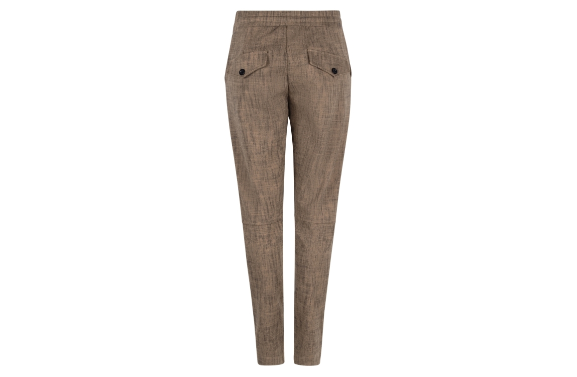 Zoso Nadine 1110 camel. Dit aangesloten model sluit door middel van een elastische boord met trekkoorden. Deze zwarte/camel gemêleerde broek van Zoso is voorzien van twee steekzakken aan de voorzijde en twee klepzakken aan de achterzijde.