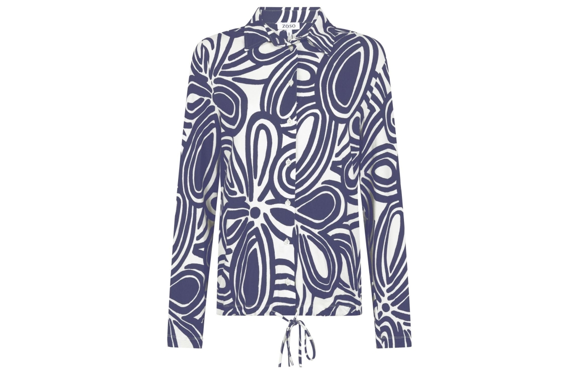 Zoso Natalia 0021-0015 kit-blue. Dit rechtvallende model is voorzien van een kraag en heeft lange mouwen. Deze donkerblauwe blouse met print van Zoso sluit door middel van knopen en trekkoorden aan de onderzijde.