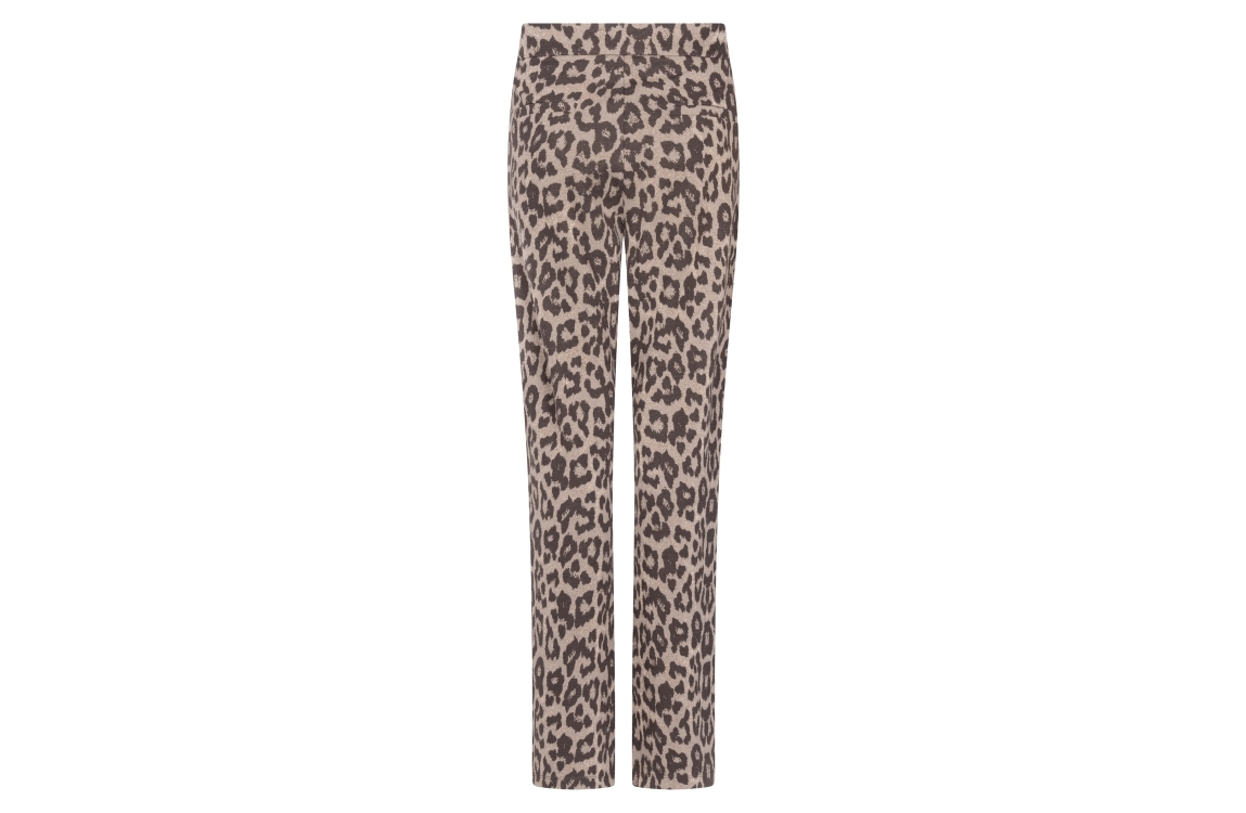 Zoso broek 254Netty. Dit rechtvallend fit model sluit door middel van een elastische boord. Deze bruine Zoso broek is bewerkt in een panter print met glitter detail. Dit model beschikt over twee steekzakken aan de voorzijde en twee paspelzakken aan de achterzijde.