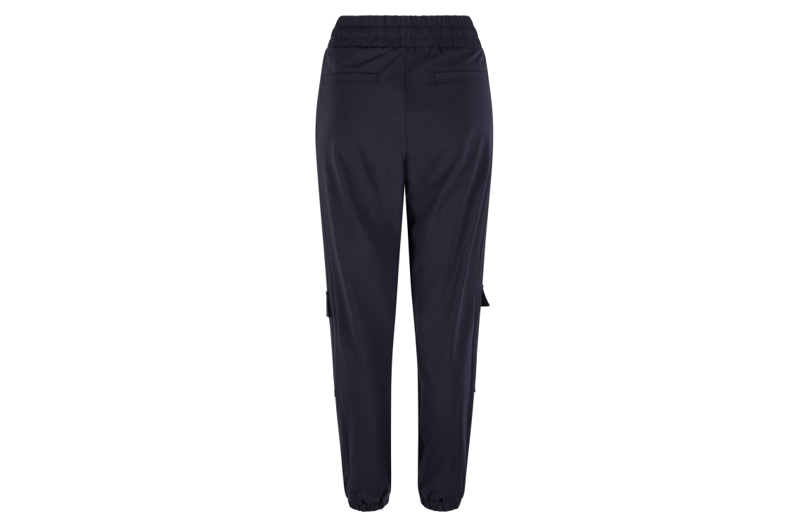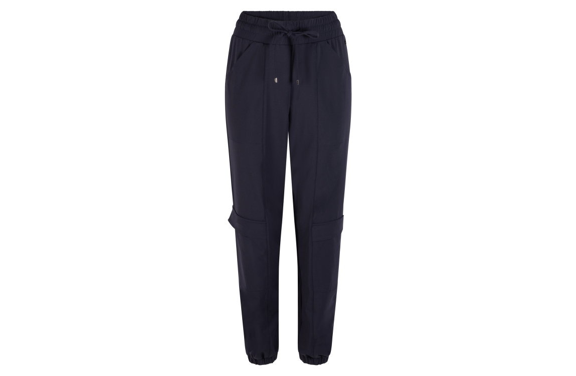 Zoso broek Nicky. Dit cargo model sluit door middel van een elastische boord met trekkoorden. Deze navy kleurige broek van Zoso is voorzien van twee steek- en klepzakken aan de voorzijde en twee paspelzakken aan de achterzijde. Dit model is aan de onderzijde afgewerkt met boorden.
