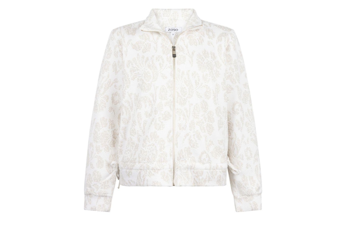 Zoso jasje Nora. Dit rechtvallend model is voorzien van een opstaande kraag en heeft lange mouwen. Deze witte/goudkleurige jasje van Zoso sluit door middel van een rits en is afgewerkt met trekkoorden aan de zijkant. Dit model beschikt over steekzakken.