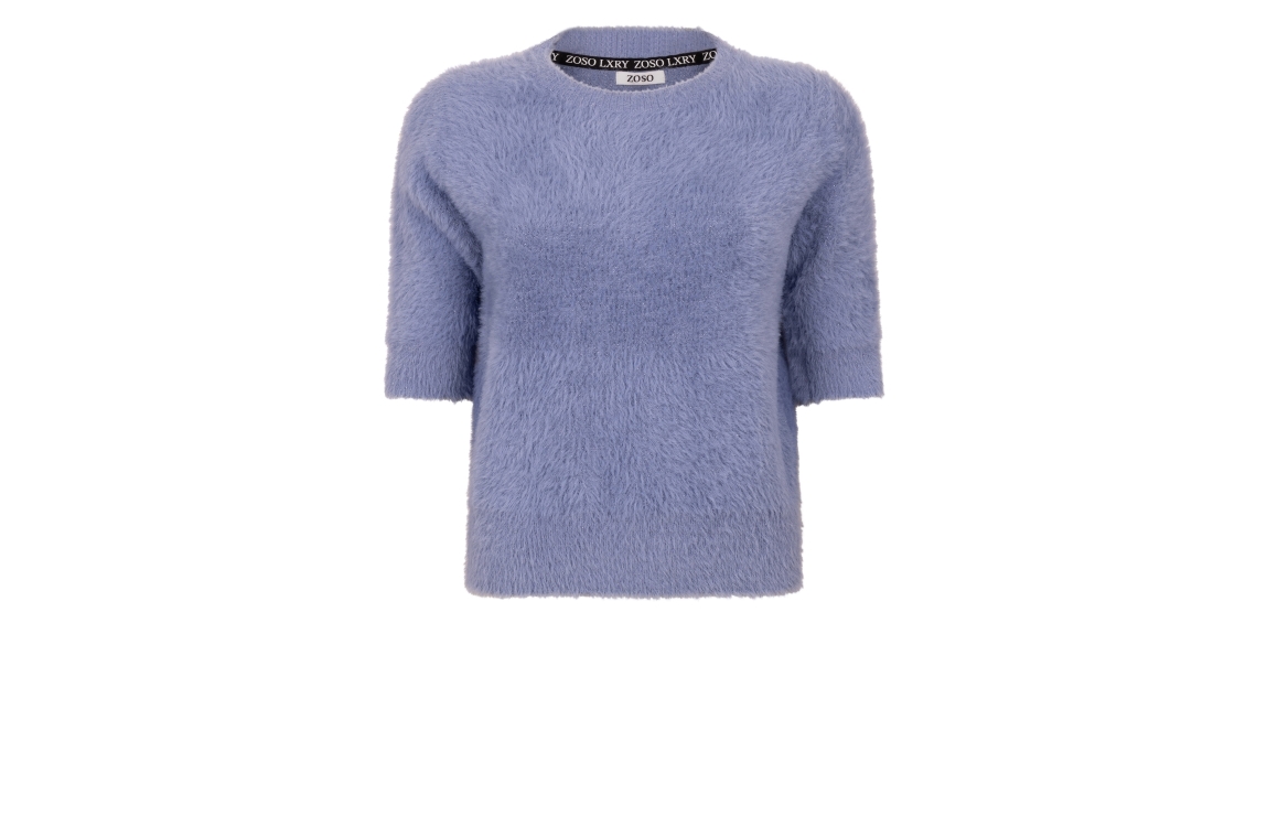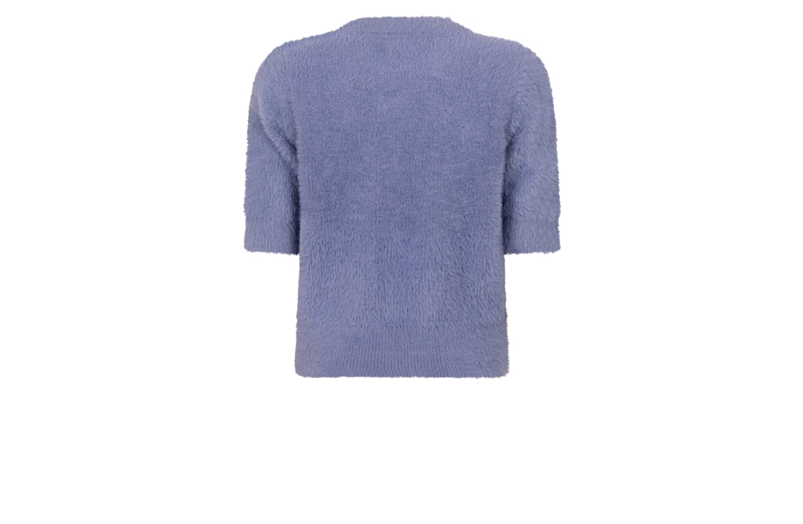 Zoso pullover Patrice. Dit rechtvallend model is voorzien van een ronde hals en heeft korte mouwen. Deze blauwe fluffy pullover van Zoso is bewerkt met glitter.