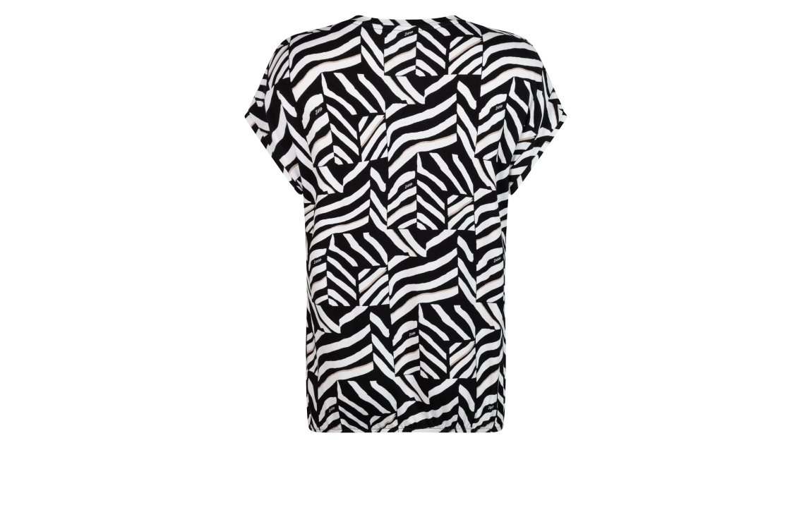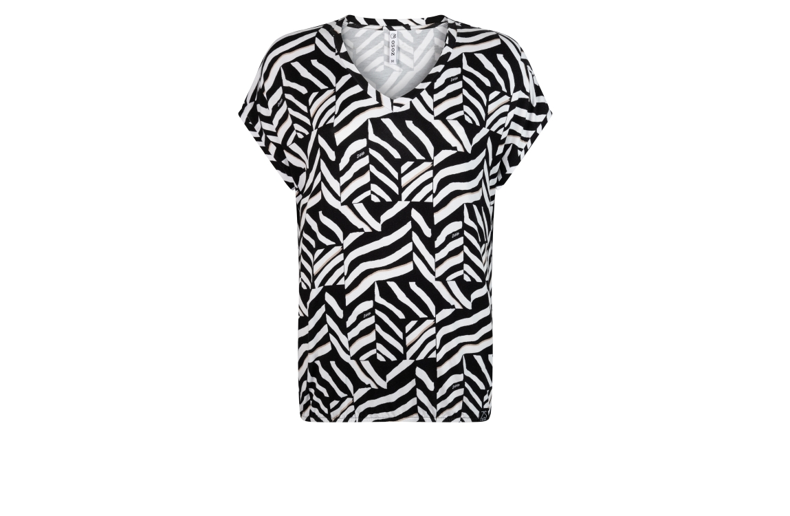 Zoso t-shirt percey. Dit rechtvallend model is voorzien van een v-hals en heeft korte mouwen. Dit zwarte/witte model van Zoso is bewerkt met een all-over motief en is afgewerkt met een elastische boord aan de onderzijde.