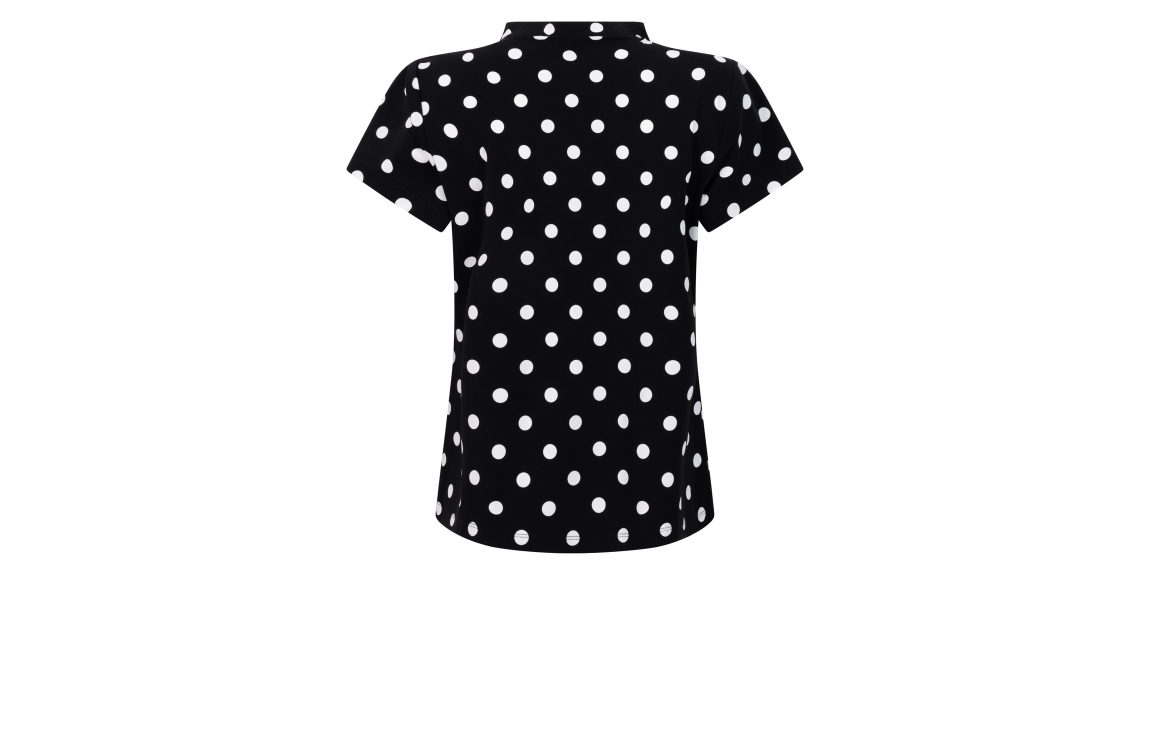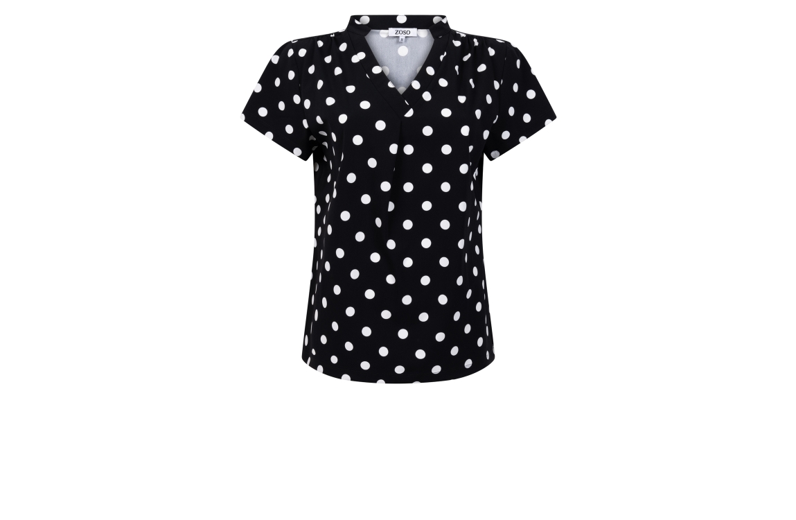 Zoso top Petra. Dit rechtvallend model is voorzien van een V-hals en heeft korte mouwen. Deze zwarte travel top van Zoso is bewerkt met witte stippen.