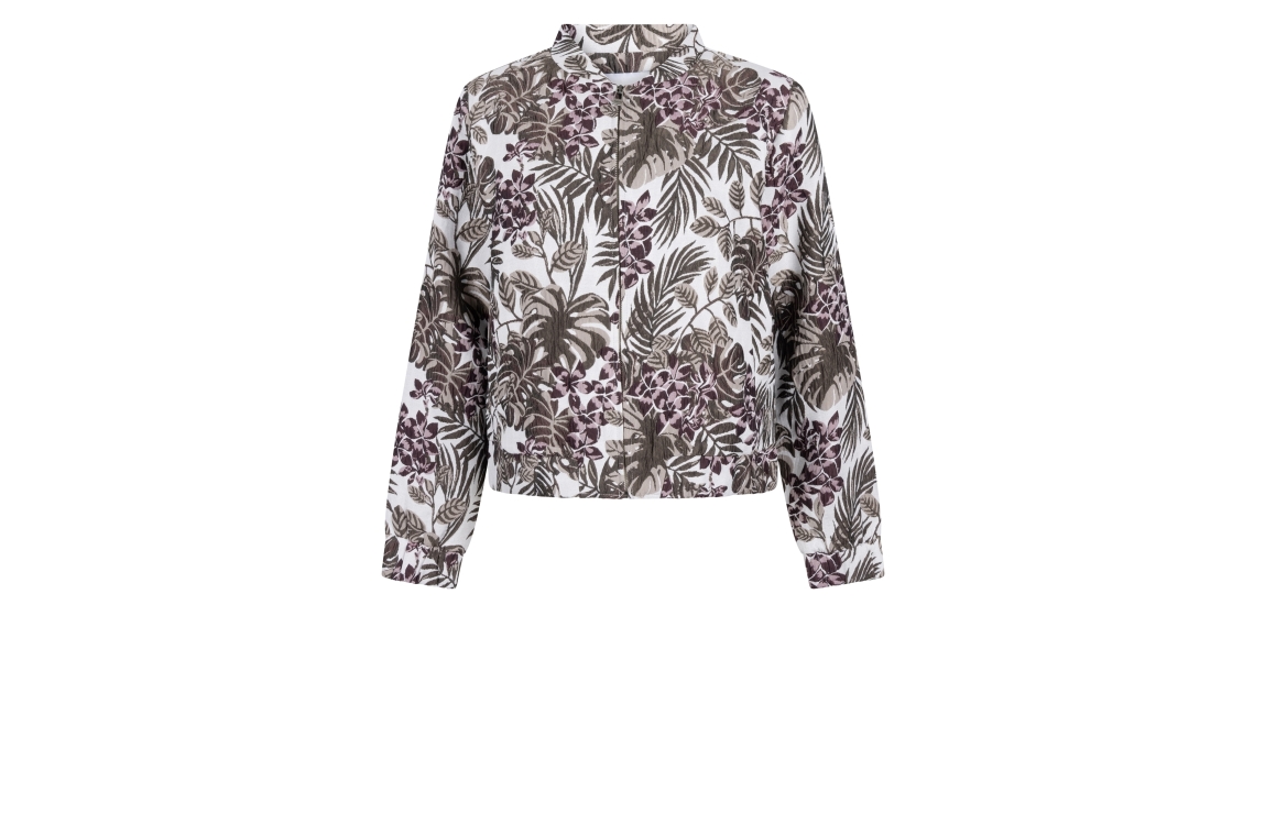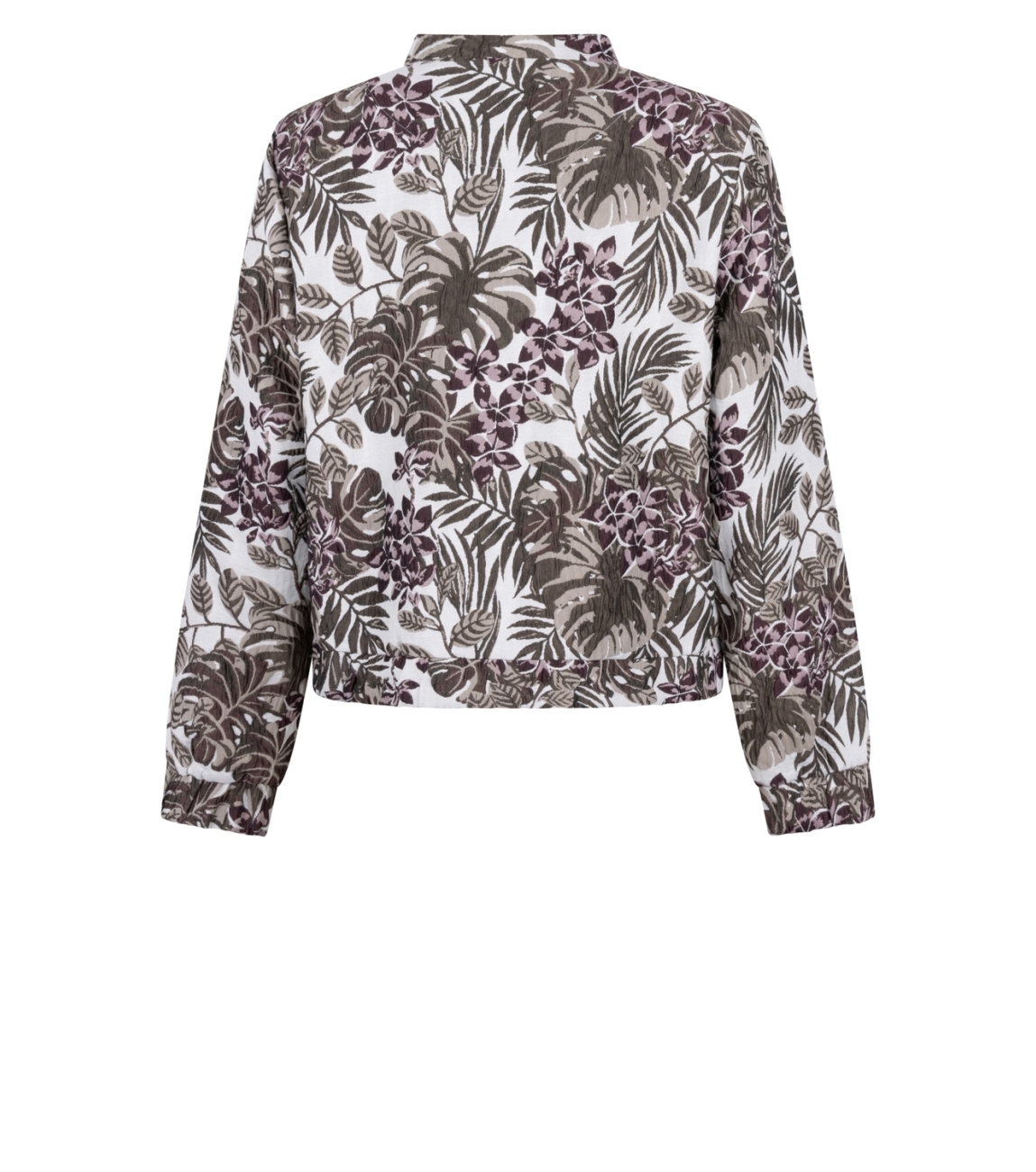 Zoso jasje 255Sandra 10002. Dit bombermodel heeft een ronde hals met opstaande kraag en lange mouwen. Deze bordeaux jasje van Zoso sluit aan de voorzijde door middel van een rits en is all-over bewerkt met een bloemenprint in verschillende kleuren. Het model is voorzien van twee steekzakken en heeft elastische boorden.