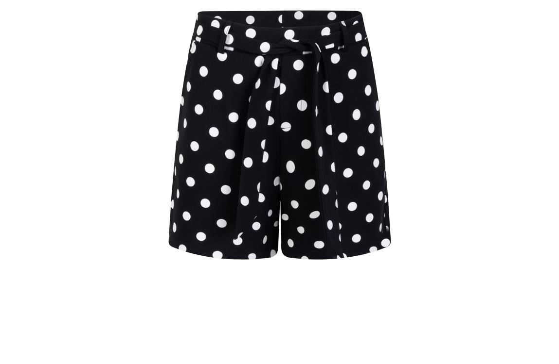 Zoso short Sarita. Dit rechtvallend model sluit door middel van een elastische boord en een afneembaar ceintuur. Deze zwarte travel short van Zoso beschikt over twee steekzakken aan de voorzijde en twee paspelzakken aan de achterzijde. Dit model is bewerkt met witte stippen.